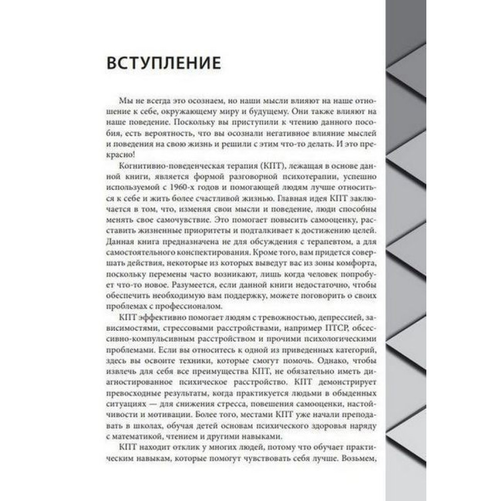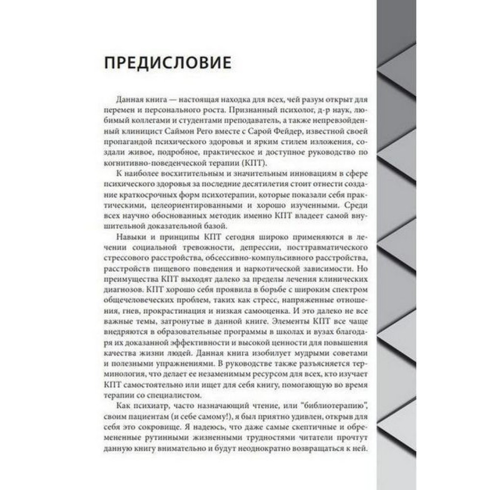 «Когнитивно-поведенческая терапия для психического здоровья. Рабочая тетрадь. Научно обоснованные упражнения для преобразования негативных мыслей и управления своим благополучием» Саймона А. Рего та Сари Фейдер навчить культивувати в собі почуття спокою і впевненості, використовуючи техніки когнітивно-поведінкової терапії, що демонструють ефективність вже протягом понад 50 років, адже не всі психічні проблеми супроводжуються клінічним діагнозом і перевертають життя з ніг на голову, проте це не відміняє їхнього впливу на загальний добробут людини.