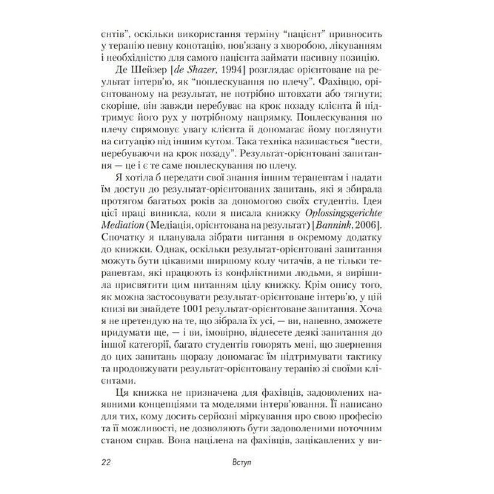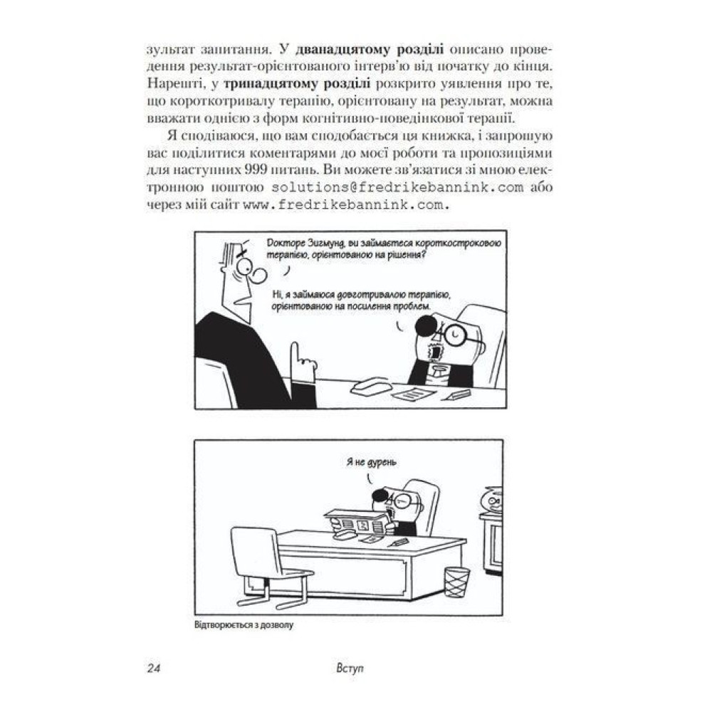 Книга «Короткотривала терапія, яка орієнтована на результат. 1001 запитання для інтерв'ювання» за авторством Фредрік Баннінк є зібранням практичних та несподіваних ідей для терапевтів. Вона буде цікава не тільки фахівцям, орієнтованим на результат. Баннінк уважна до деталей і ділиться у своїй роботі глибокими знаннями в терапії доступною мовою.