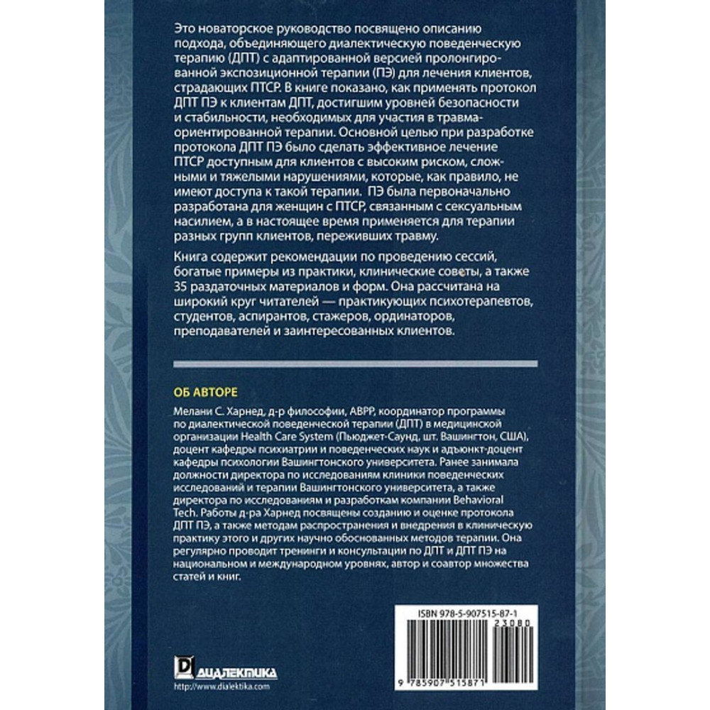 Цей новаторський посібник «Лечение травмы в диалектической поведенческой терапии: ДПТ протокол пролонгированной экспозиции» за авторством Мелані С. Харнед присвячений опису підходу, що об'єднує діалектичну поведінкову терапію (ДПТ) з адаптованою версією пролонгованої експозиційної терапії (ПЕ) для лікування клієнтів, які страждають на ПТСР.