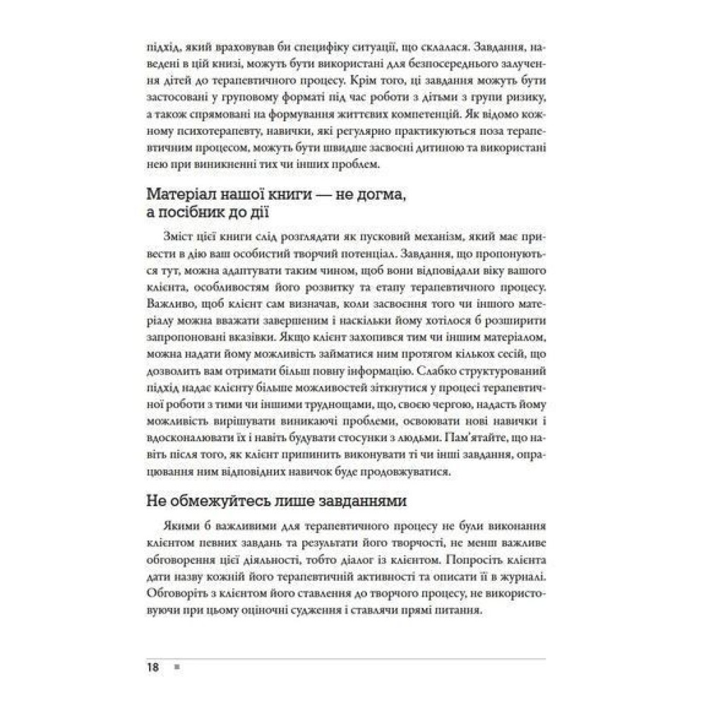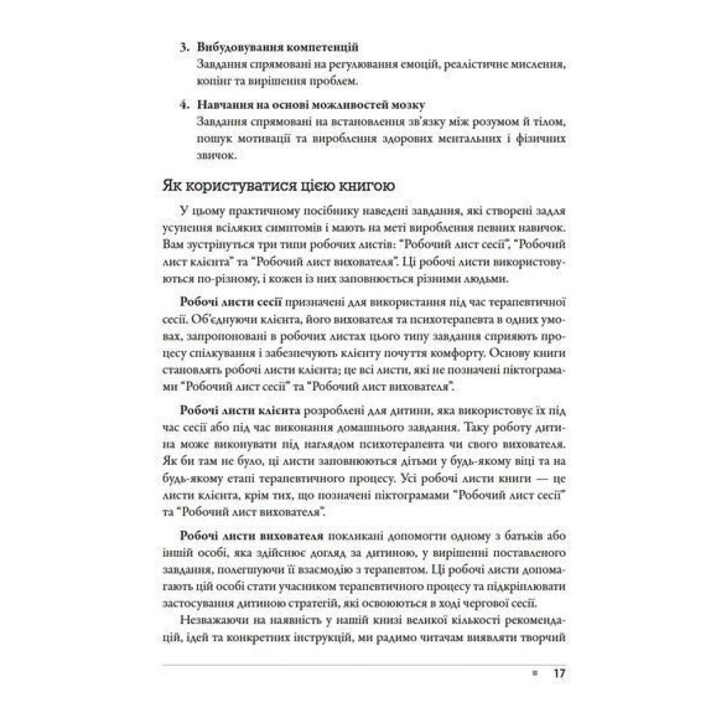 Також читачі знайдуть тут матеріали, спеціально розроблені для різних типів клієнтів, і вправи, націлені на подолання специфічних проблем, що часто виникають під час сеансів.