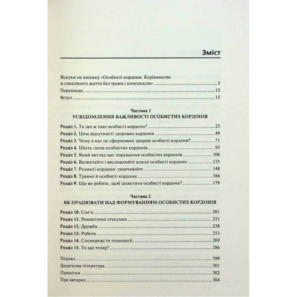 «Особисті кордони» — це докладний, практичний посібник із психоемоційного самозахисту, написаний ліцензованою терапевткою. Книга пояснює, як встановлення та підтримка здорових меж у всіх сферах життя — родині, роботі, дружбі, коханні — є основою внутрішнього спокою, самоповаги і психічного здоров’я.