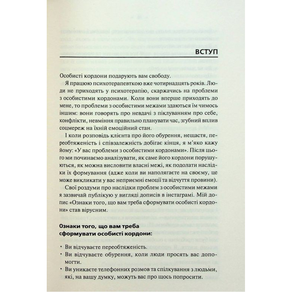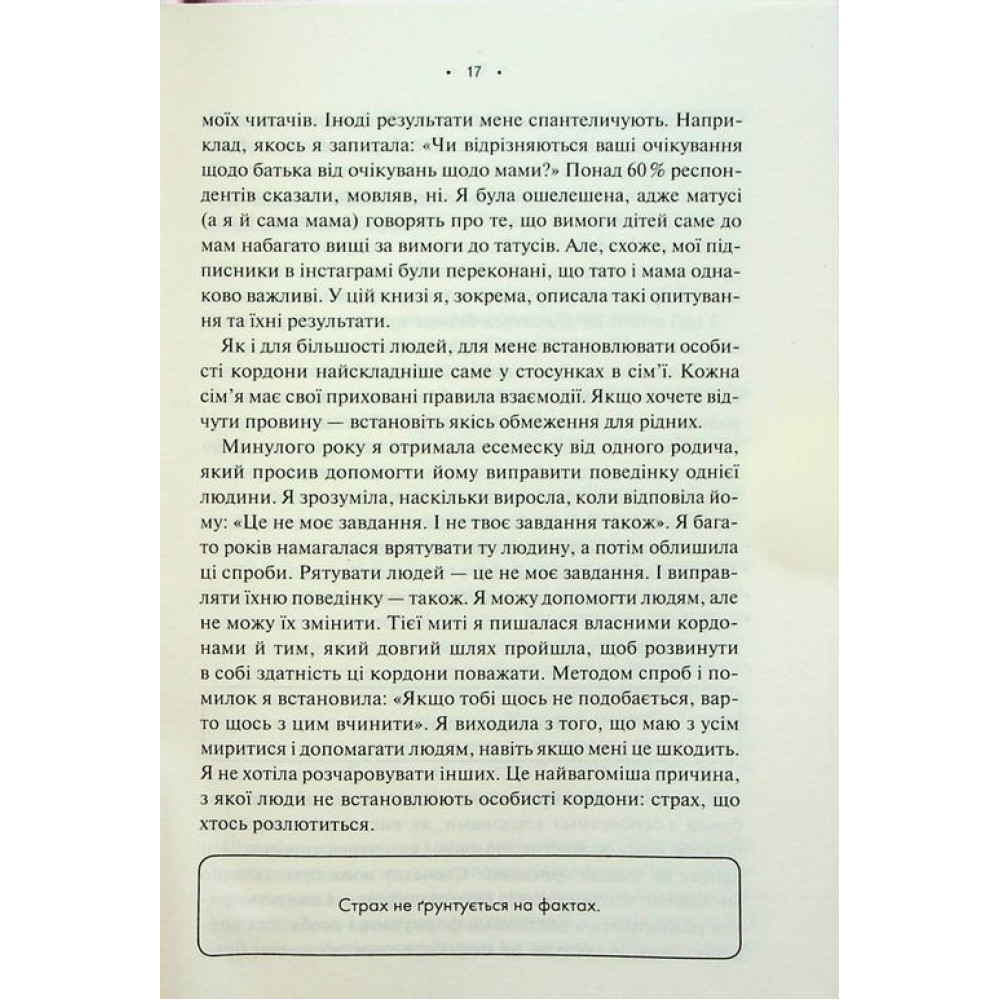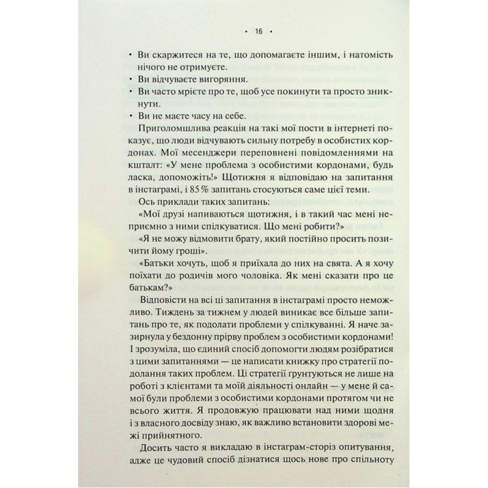 Це ідеальна книга для тих, хто залежний від чужої думки та занадто догоджає іншим, або, наприклад має складні стосунки з батьками, партнером, колегами й тим часом страждає від тривожності, вигорання, емоційного виснаження тощо.