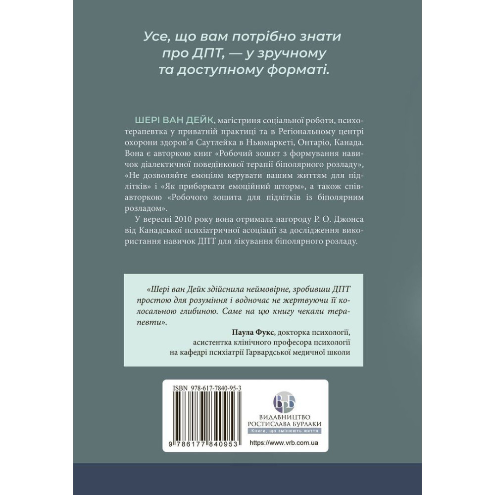 Шері ван Дейк — магістриня соціальної роботи, психотерапевтка у приватній практиці та в Регіональному центрі охорони здоров'я Саутлейка в Ньюмаркеті, Онтаріо, Канада. Вона є авторкою книг «Робочий зошит з формування навичок діалектичної поведінкової терапії біполярного розладу», «Не дозволяйте емоціям керувати вашим життям для підлітків» і «Як приборкати емоційний шторм», а також співавторкою «Робочого зошита для підлітків із біполярним розладом». У вересні 2010 року вона отримала нагорода Р. О. Джонса від Канадської психіатричної асоціації за дослідження використання навичок ДПТ для лікування біполярного розладу.
