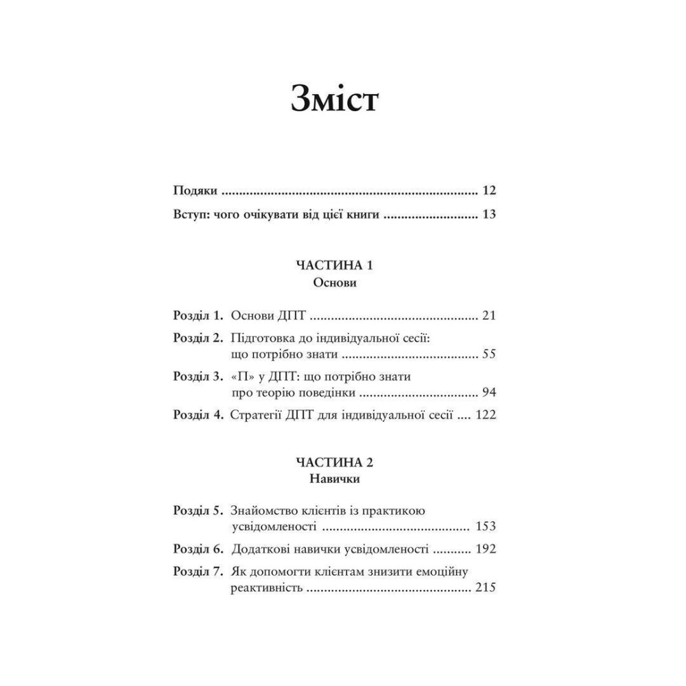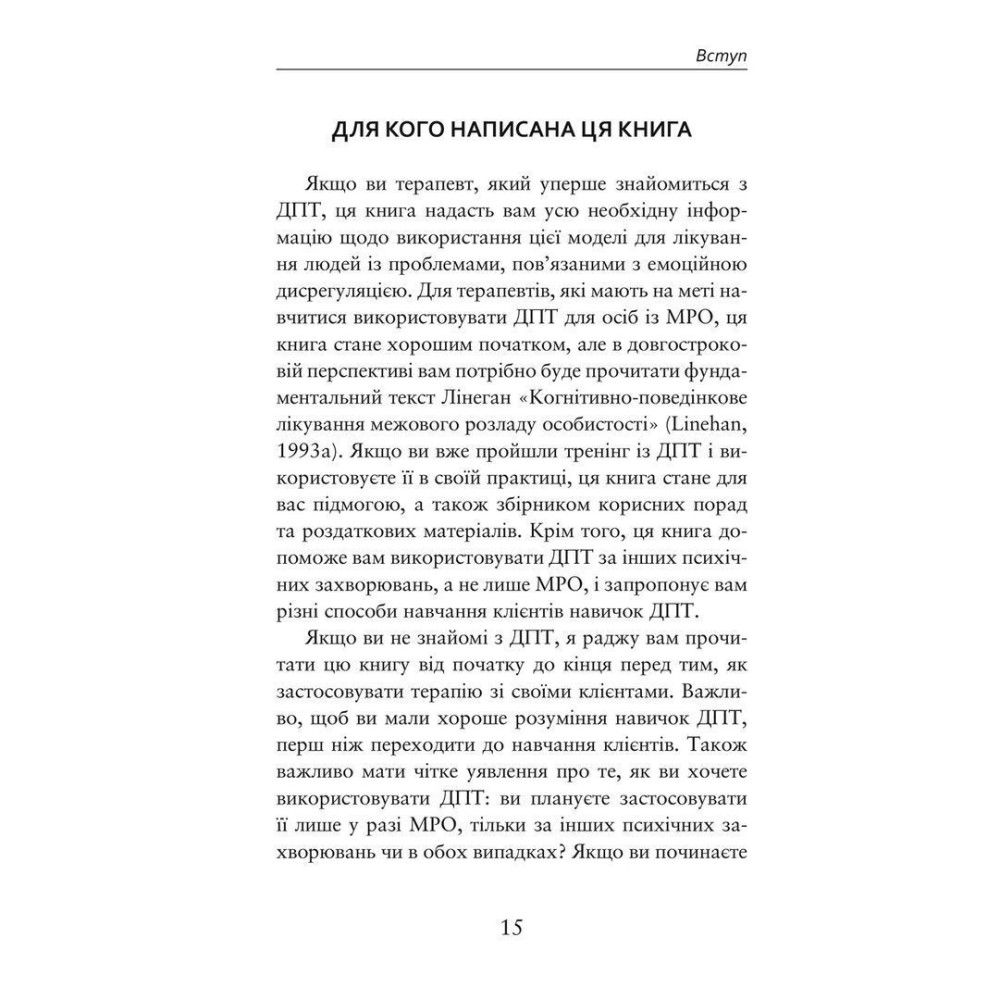 Основна мета цієї популярної книги — дати терапевтам базове розуміння теорії, яка лежить в основі ДПТ, стратегій, що використовуються в індивідуальних сесіях, які відрізняють її від традиційної КПТ, а також безпосередньо навичок ДПТ. Цей посібник зробить ДПТ більш доступною для терапевтів, котрі не звикли до неї, а також відкриє її звичайним пацієнтам у зрозумілій формі, які могли б отримати користь від такого лікування.