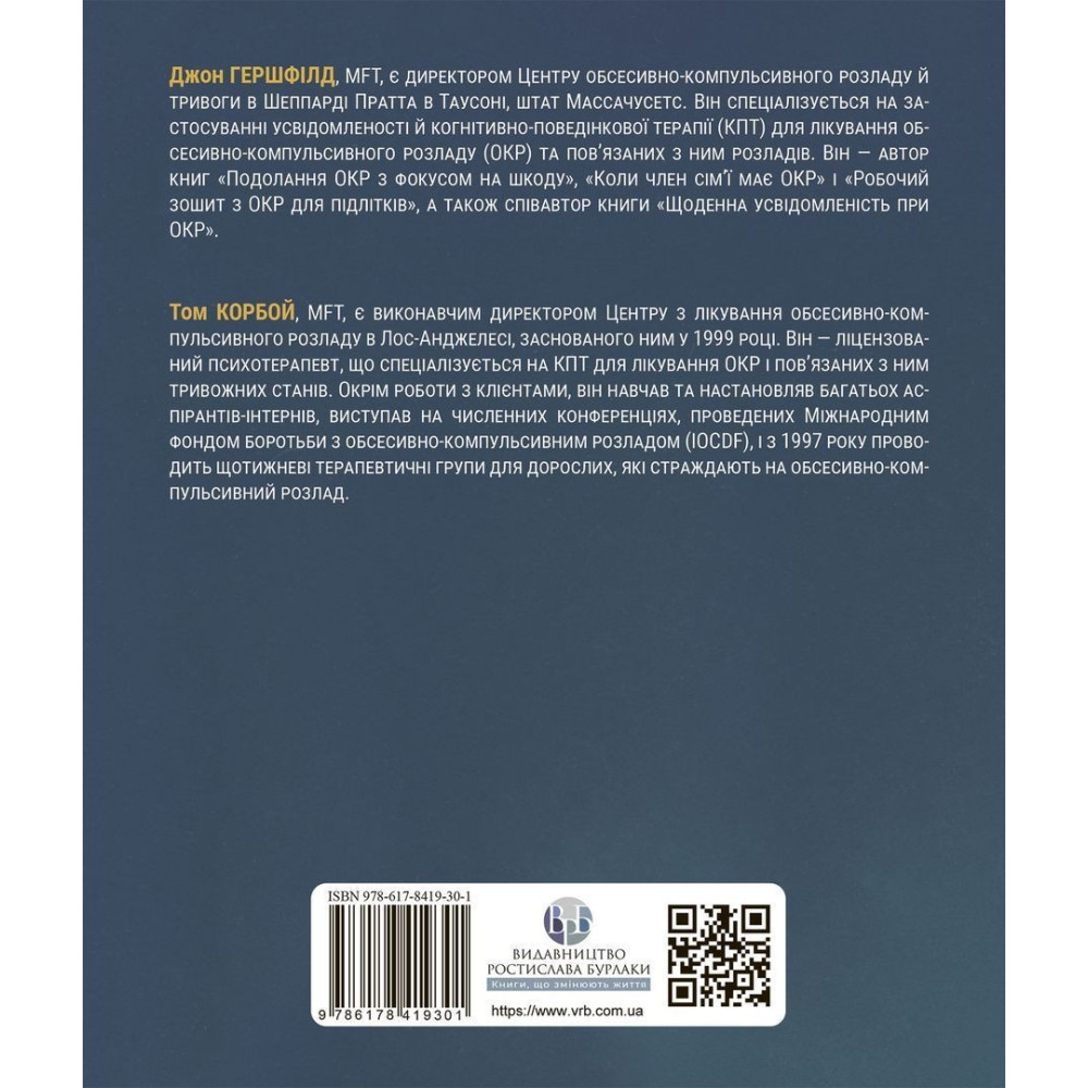 «Робочий зошит з усвідомленості при ОКР. Посібник з подолання обсесій і компульсій за допомогою усвідомленості й когнітивно-поведінкової терапії» від Джона Гершфілда й Тома Корбоя є практичним керівництвом для людей, які борються з обсесивно-компульсивним розладом (ОКР). Автори — психотерапевти Джон Гершфілд та Том Корбой — поєднують два найефективніші підходи сучасної психотерапії: когнітивно-поведінкову терапію (КПТ), зокрема методи експозиції з попередженням реакції (ERP), та усвідомленість (mindfulness).
