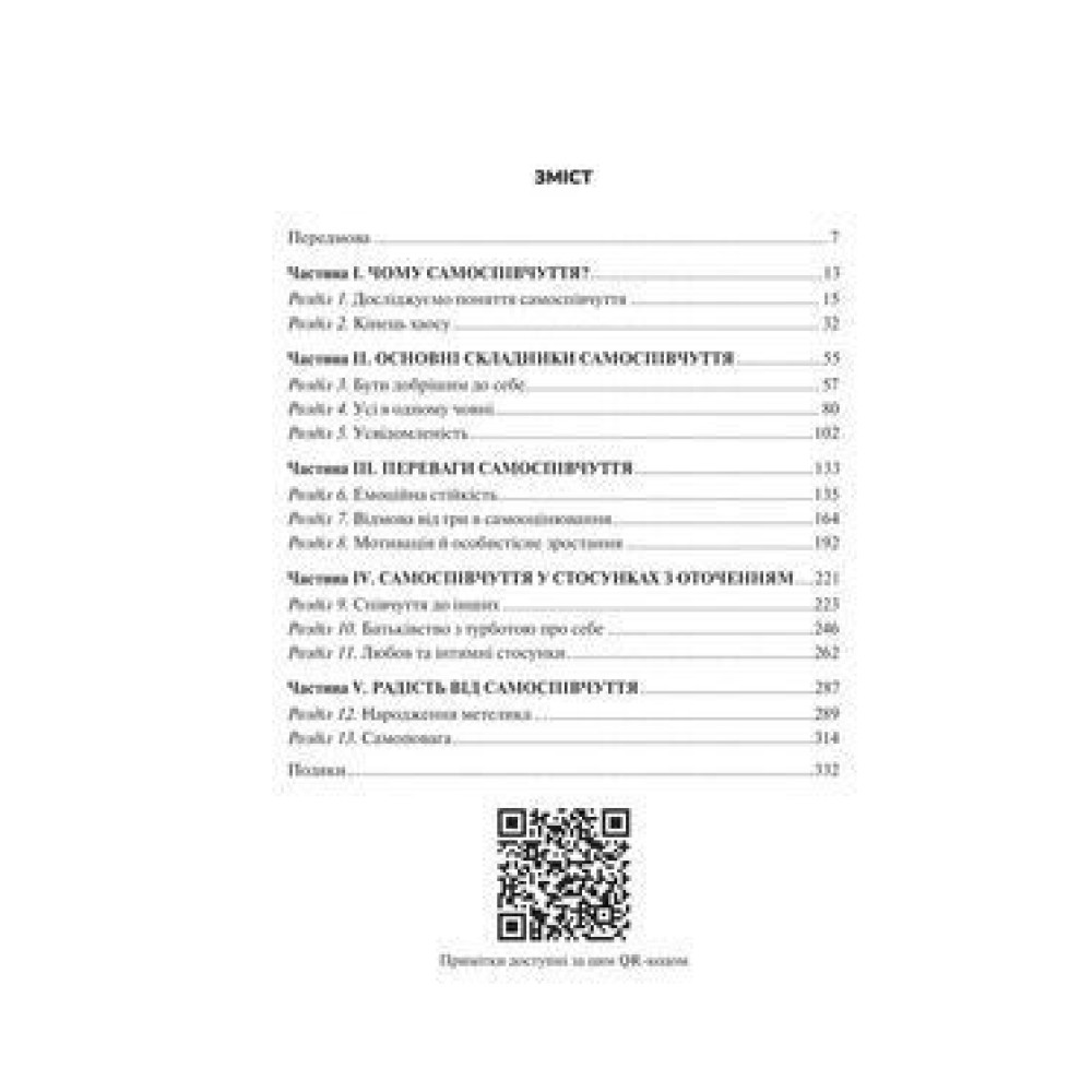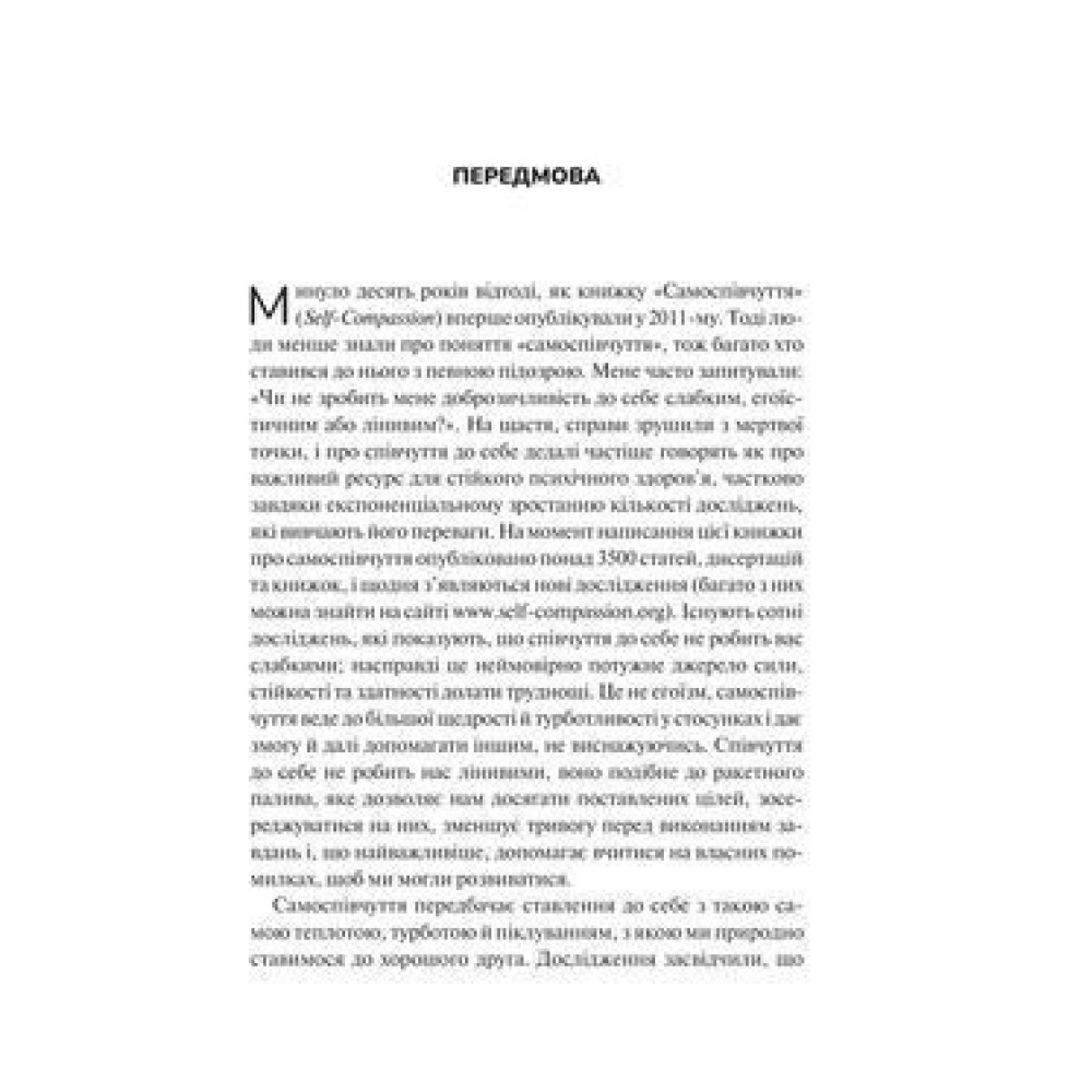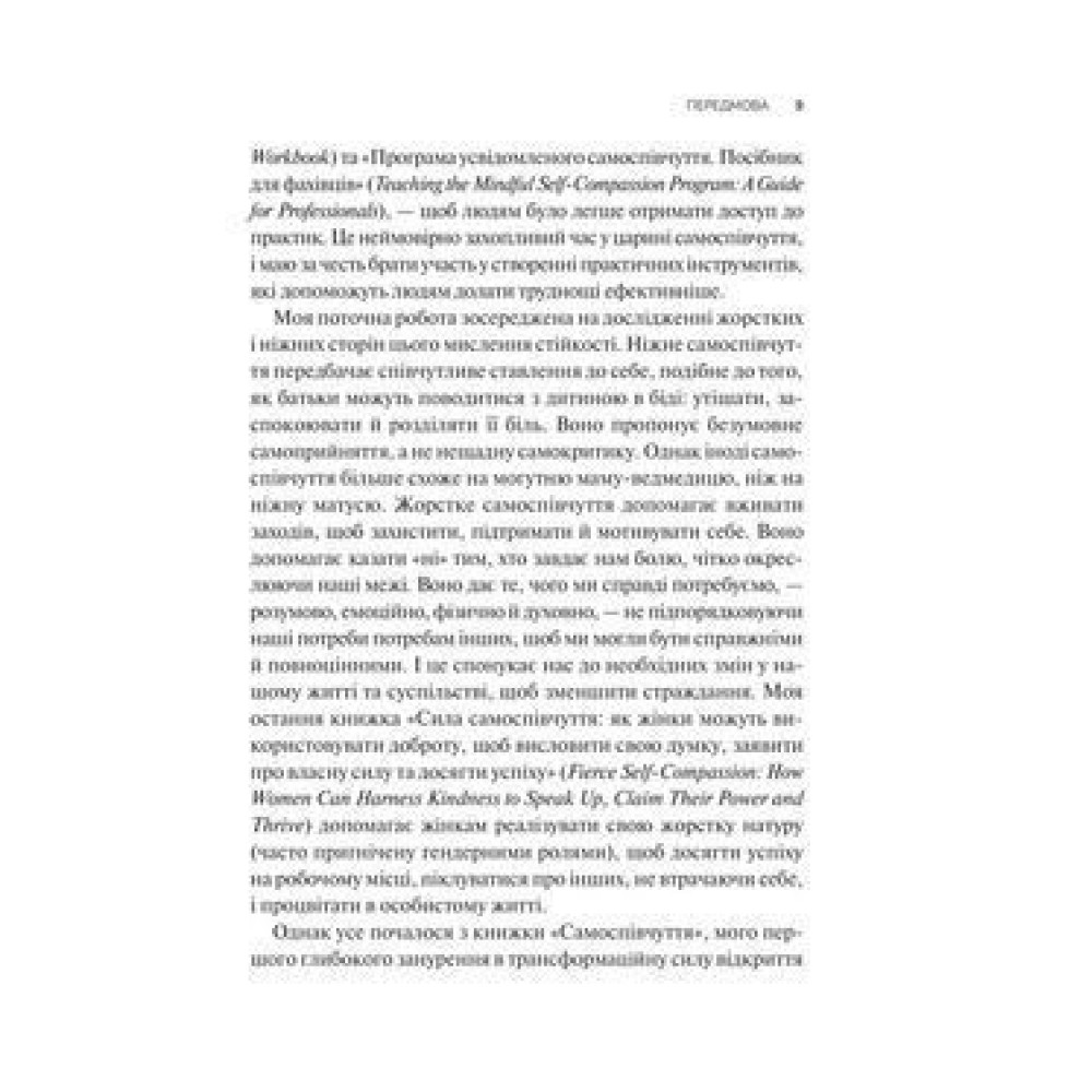 У книзі зібрані перевірені практики самоспівчуття — від навичок турботи про себе до вправ з усвідомленості, які сприяють стабільності, довірі до життя та відновленню внутрішнього ресурсу. Крістін Нефф приділяє увагу також універсальному досвіду людських страждань, допомагаючи читачам побачити у власних труднощах не слабкість, а природну частину спільного людського шляху.