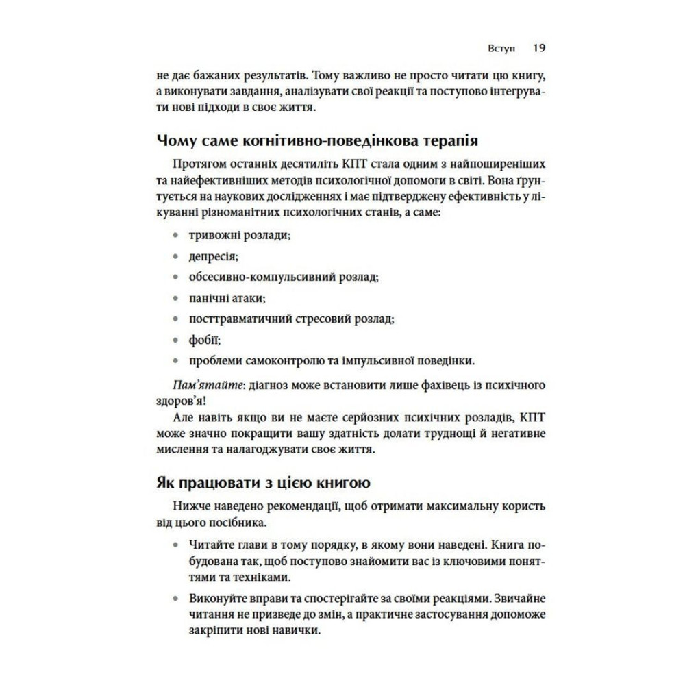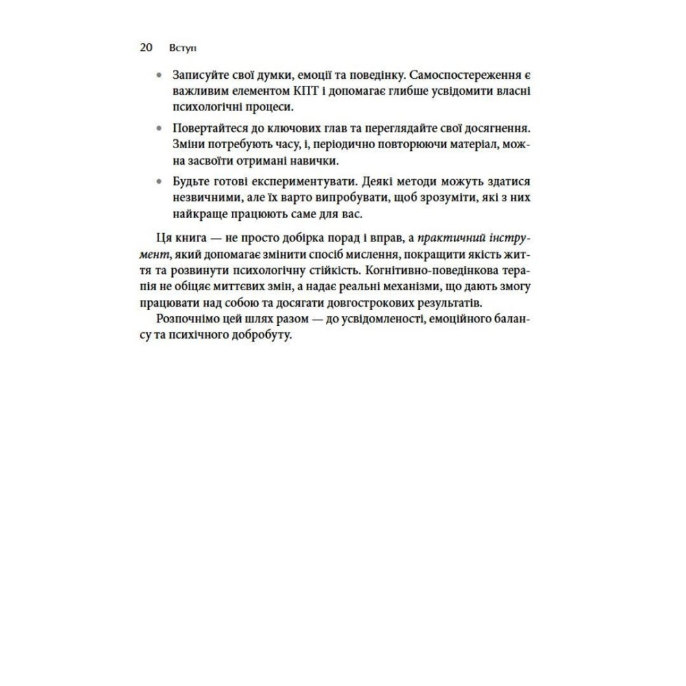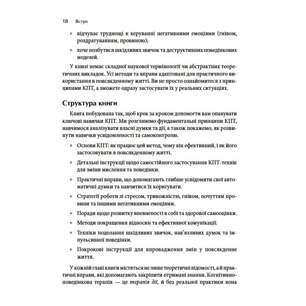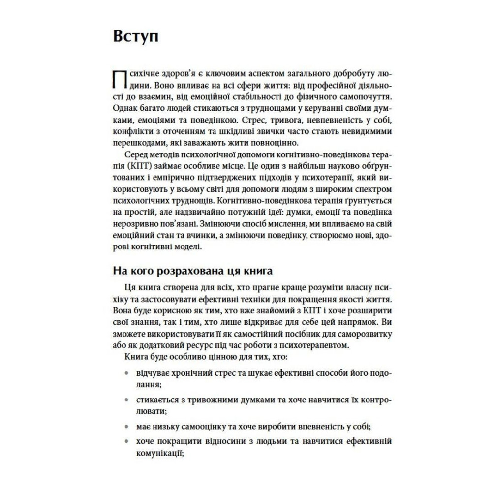 Книжка Холлі Фрейзер «Трансформація мислення за допомогою когнітивно-поведінкової терапії: робочий зошит» базується на когнітивно-поведінковій терапії (КПТ) — одному з найефективніших науково обr'рунтованих підходів до роботи з думками, емоціями та поведінкою. Авторка не лише пояснює ключові концепції КПТ, а й пропонує покрокові вправи, які допоможуть навчитися контролювати тривогу, знижувати рівень стресу, формувати здорову самооцінку та позбавлятися від шкідливих шаблонів мислення.