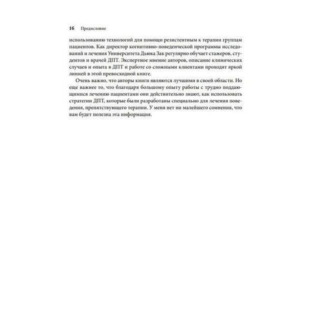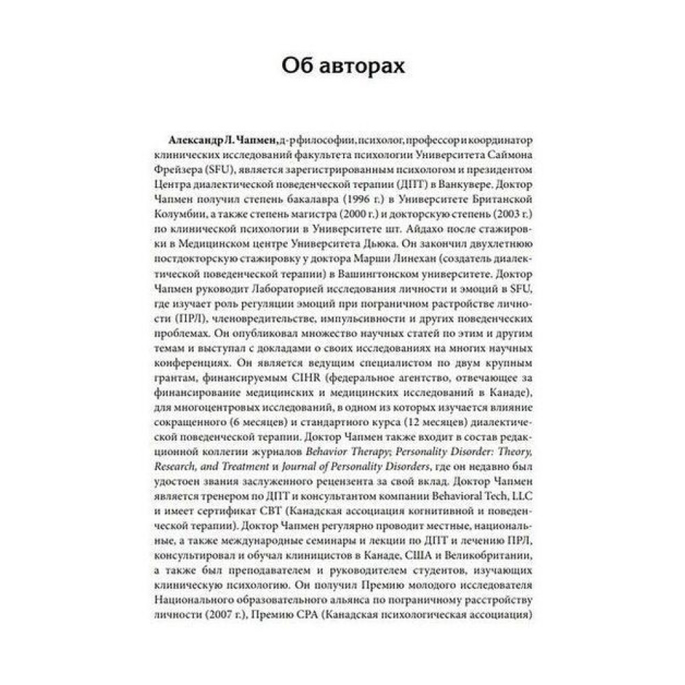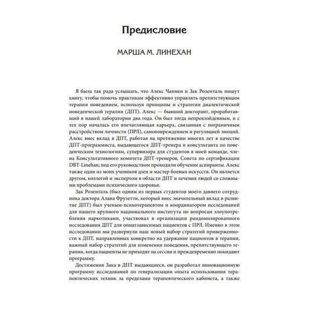 Представлені в книзі Александра Л. Чапмена та М. Закарі Розенталя «Управление препятствующим терапии поведением. Стратегии диалектической поведенческой терапии» стратегії застосовні до багатьох типів пацієнтів у різних умовах. Завдяки оригінальним дослідницьким матеріалам, докладному опису процедур і стислому узагальненню великої кількості доступних досліджень ця книга є життєво важливим джерелом як для досвідчених клініцистів ДПТ, так і для тих, хто прагне впровадити елементи ДПТ у клінічну практику.
