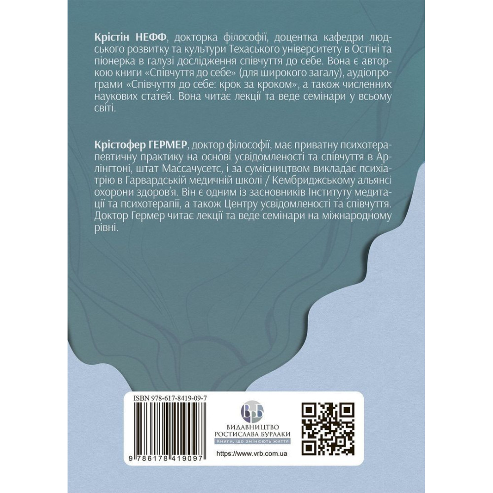 Книга, випущена у зручному великому форматі, базується на новаторській восьмитижневій програмі авторів «Усвідомлене самоспівчуття» (MSC), яка допомогла десяткам тисяч людей по всьому світу. Вона містить медитації з інструкціями (з аудіозаписами для завантаження), неформальні вправи, які можна виконувати в будь-який час і в будь-якому місці, а також яскраві історії людей, які використовують ці техніки для вирішення проблем у стосунках, проблем із вагою та зовнішністю, проблем зі здоров'ям, тривоги та інших поширених проблем.