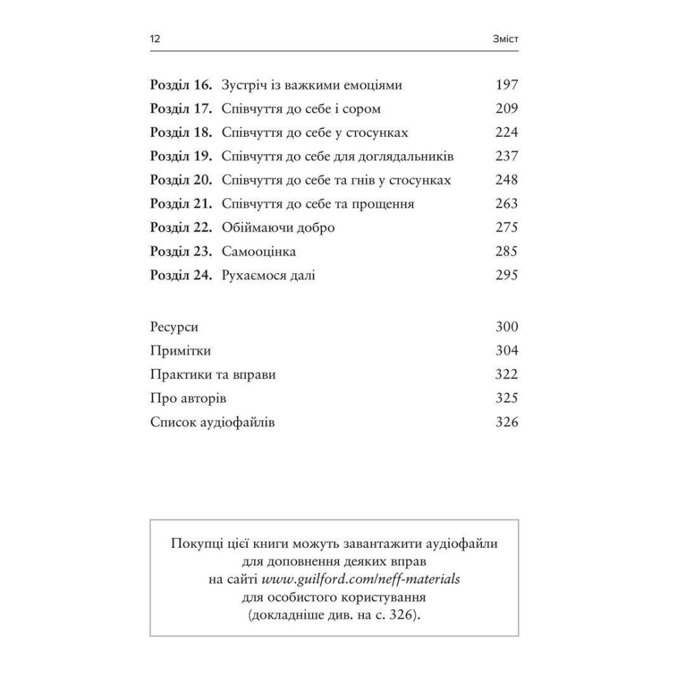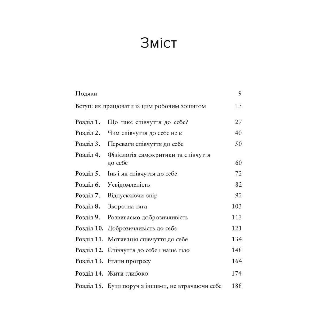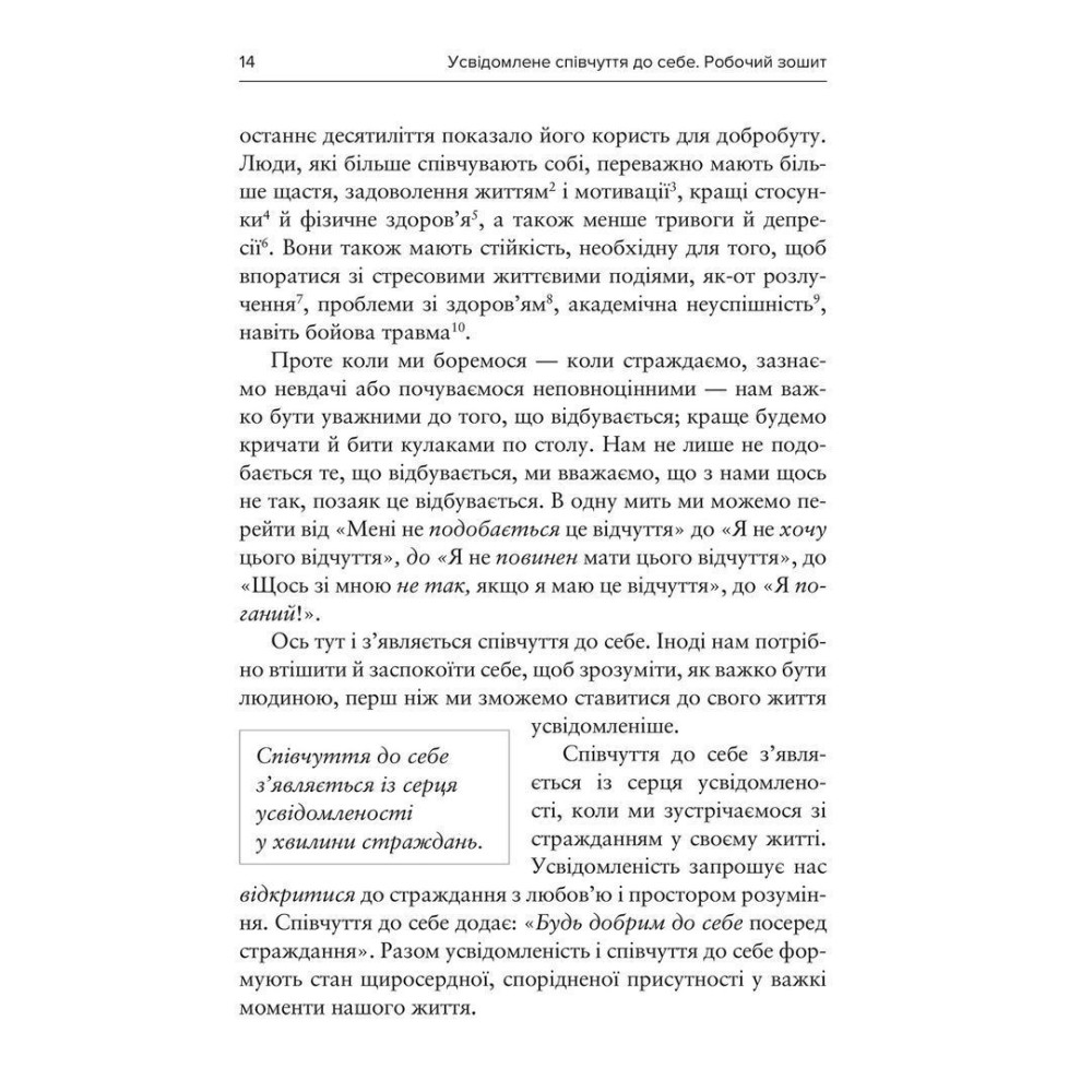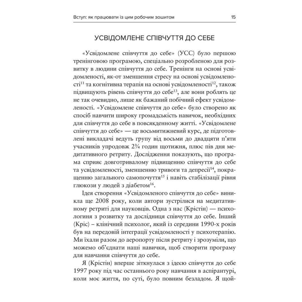 Цей науково обґрунтований посібник «Усвідомлене співчуття до себе. Робочий зошит» від Крістін Нефф і Крістофера Гермера пропонує покроковий підхід до позбавлення від суворих самооцінок і неможливих стандартів з метою розвитку емоційного благополуччя.