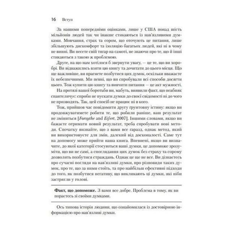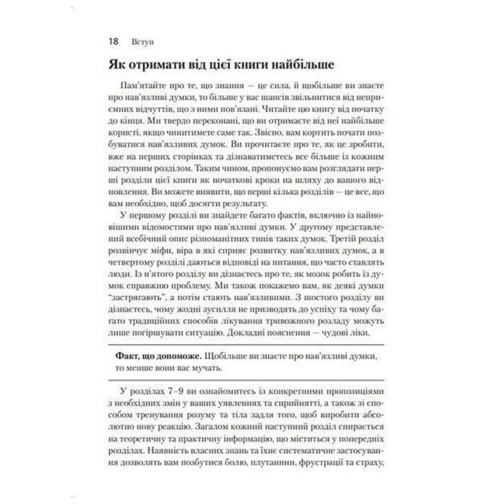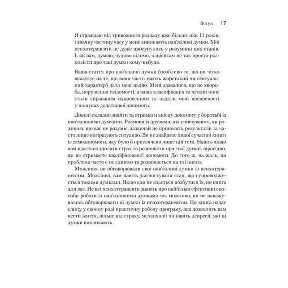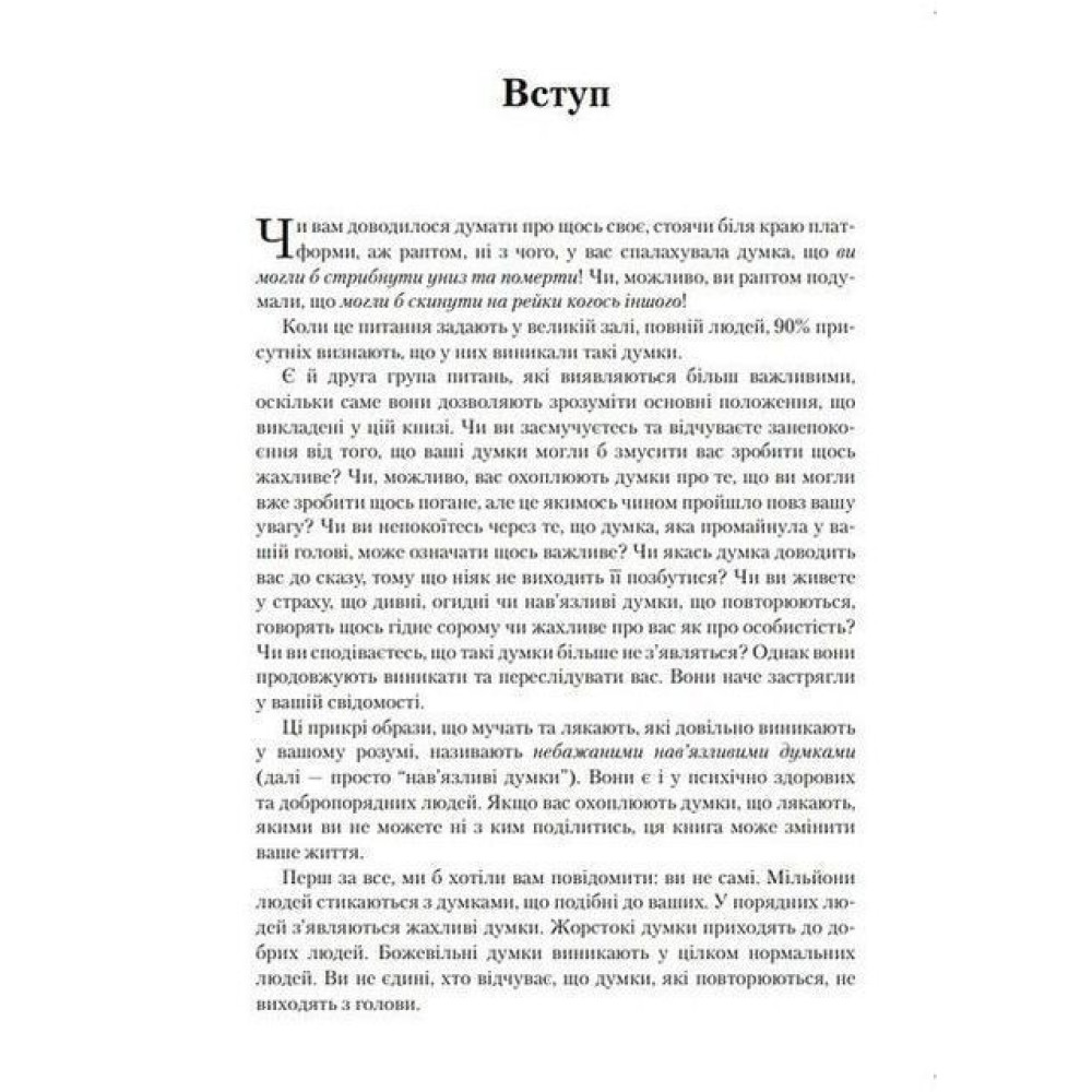 У вас бували колись думки, що лякають? Нав'язливі чи тривожні? Наприклад, коли ви погладили кошеня й подумали: «Я можу легко розтрощити йому голову». Або ви втішали друга, що пережив провал у особистому житті, й потай смакували принизливі деталі того, що він про це розповів. Чи їхали із родиною в автомобілі та у подробицях уявляли, як втрачаєте керування машиною та виїжджаєте на зустрічну смугу? Ці ганебні думки виникають у всіх, і у розумних та добропорядних людей також. Добра новина: є чудовий спосіб позбутися страждань, що спричиняють такі думки.