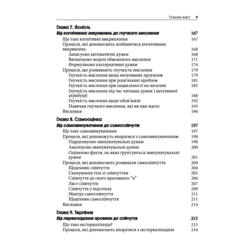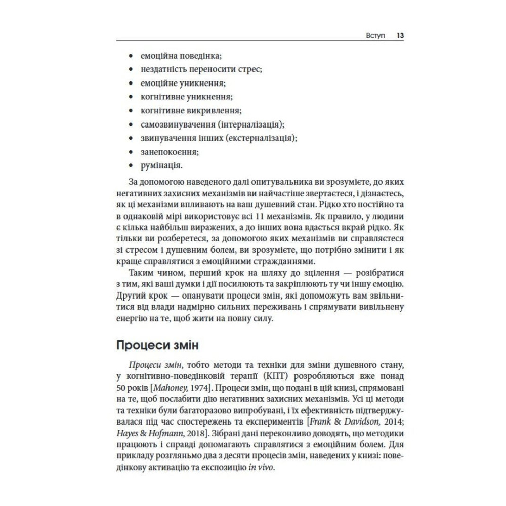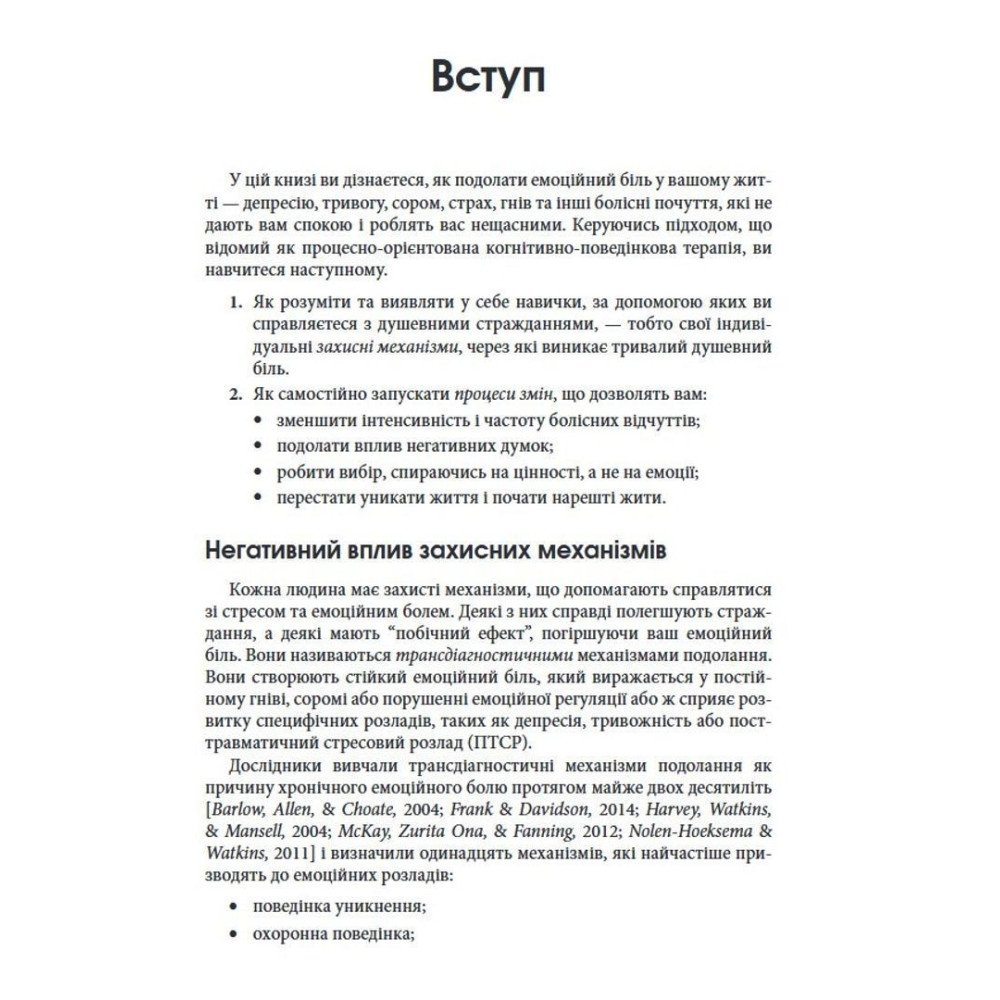 Автори книги — Метью Маккей, Патрік Феннінг, Еріка Пул та Патрісія Е. Зуріта Она — пропонують дієвий покроковий план зменшення емоційного болю на основі когнітивно-поведінкової терапії (КПТ). Завдяки гнучкому адаптованому підходу можна визначити глибинні причини емоційних страждань (уникнення, інтерналізація або румінація), щоб нарешті подолати важкі думки та почуття й почати вести повноцінне життя.