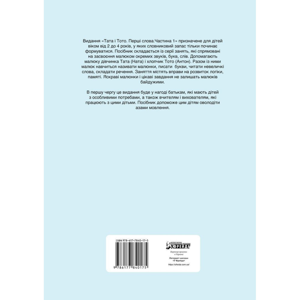 Видання «Тата і Тото. Перші слова. Частина 1» за авторством Наталії Козак призначене для дітей віком від 2 до 4 років, у яких словниковий запас тільки починає формуватися.