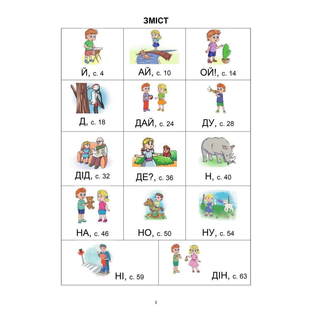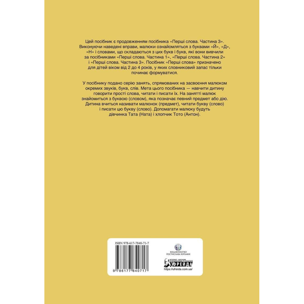 Виконуючи наведені вправи, малюки ознайомляться з буквами «Й», «Д», «Н» і словами, що складаються з цих букв і букв, які вони вивчили за посібниками «Перші слова. Частина 1», «Перші слова. Частина 2» і «Перші слова. Частина 3».