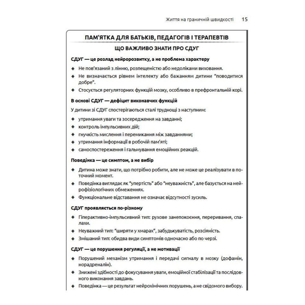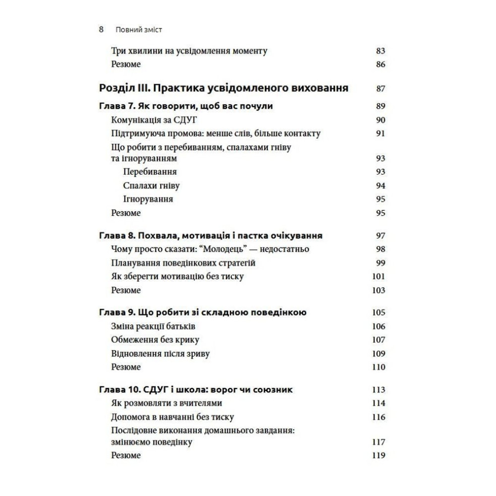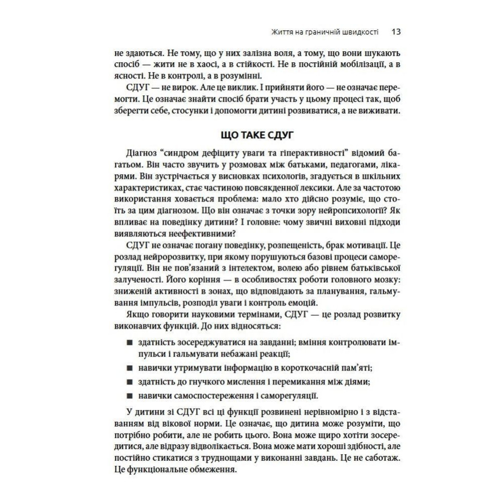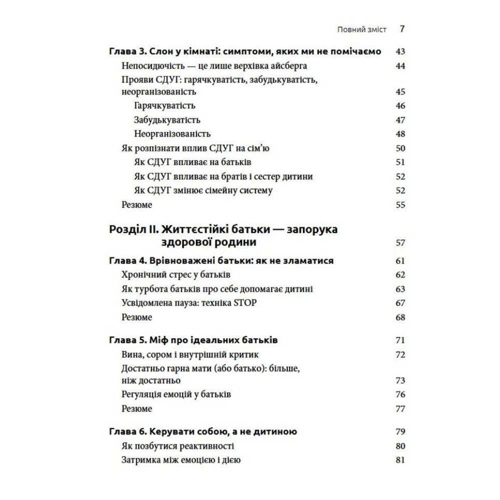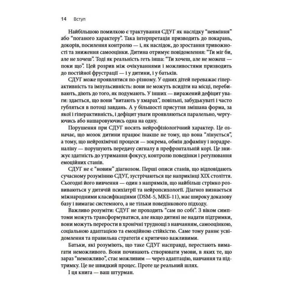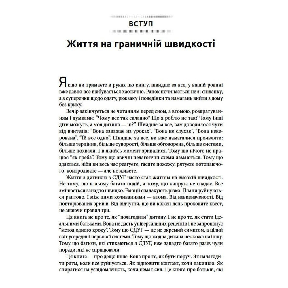 У центрі уваги тут — не контроль, а усвідомленість: уміння зупинитися, переключитися й відновити контакт із дитиною в складні моменти. Батькам пропонується зосередитись не на подоланні симптомів, а на створенні середовища, в якому і дитині, і дорослому легше взаємодіяти. Ця книга допомагає поглянути на СДУГ по-новому, зрозуміти справжні потреби дитини та знизити рівень стресу в сім'ї.