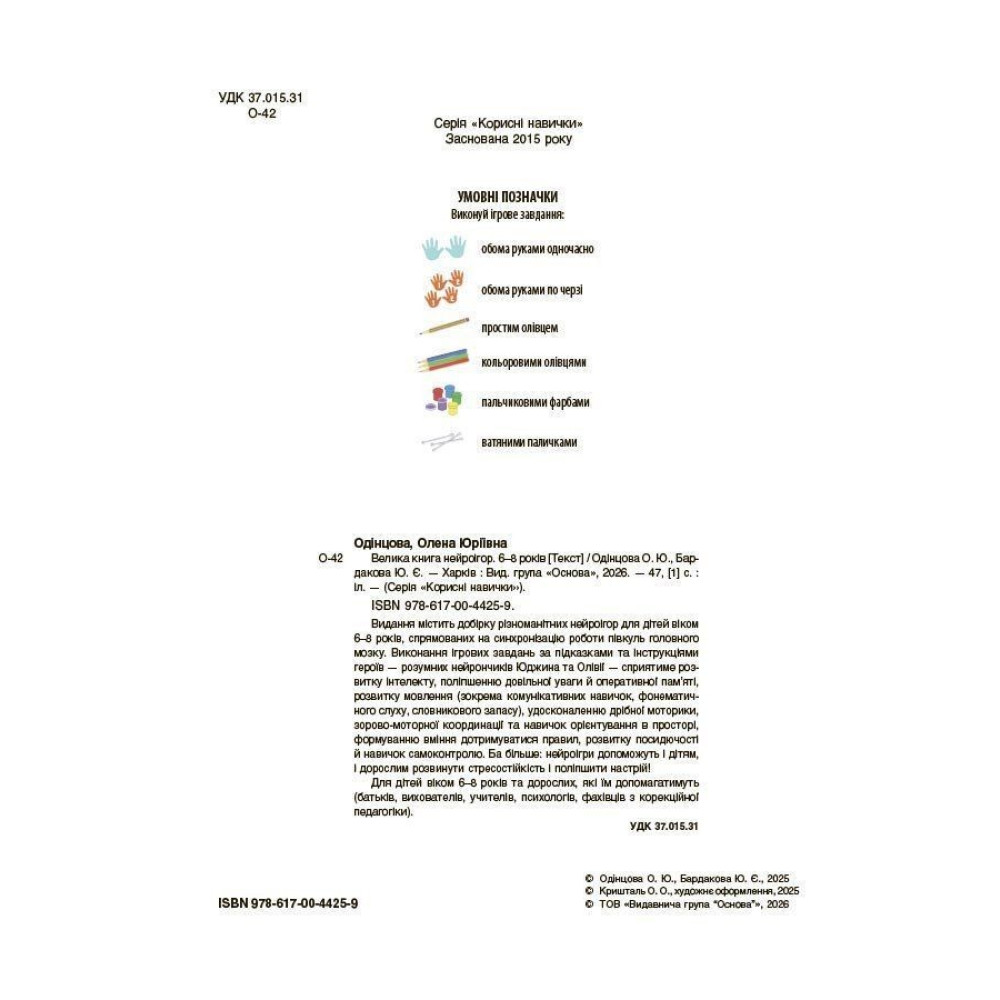 Олена Одінцова, Юлія Бардакова — «Велика книга нейроігор. 6–8 років» — це ефективний розвивальний посібник для дітей молодшого шкільного віку, створений на основі сучасних нейропедагогічних підходів. Книжка містить 40+ нейроігор, які в ігровій формі допомагають дитині розвивати інтелект, увагу, мовлення та дрібну моторику, а також формувати нові нейронні зв’язки й покращувати взаємодію півкуль мозку.