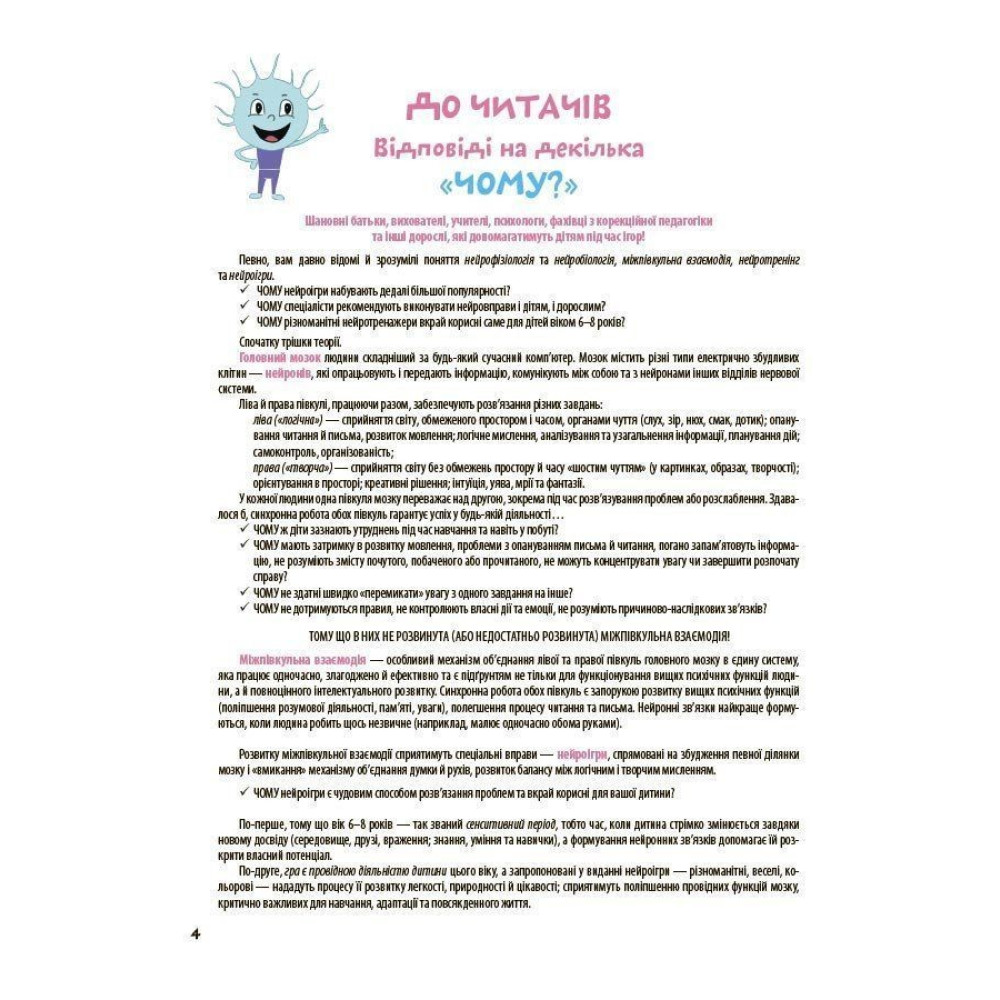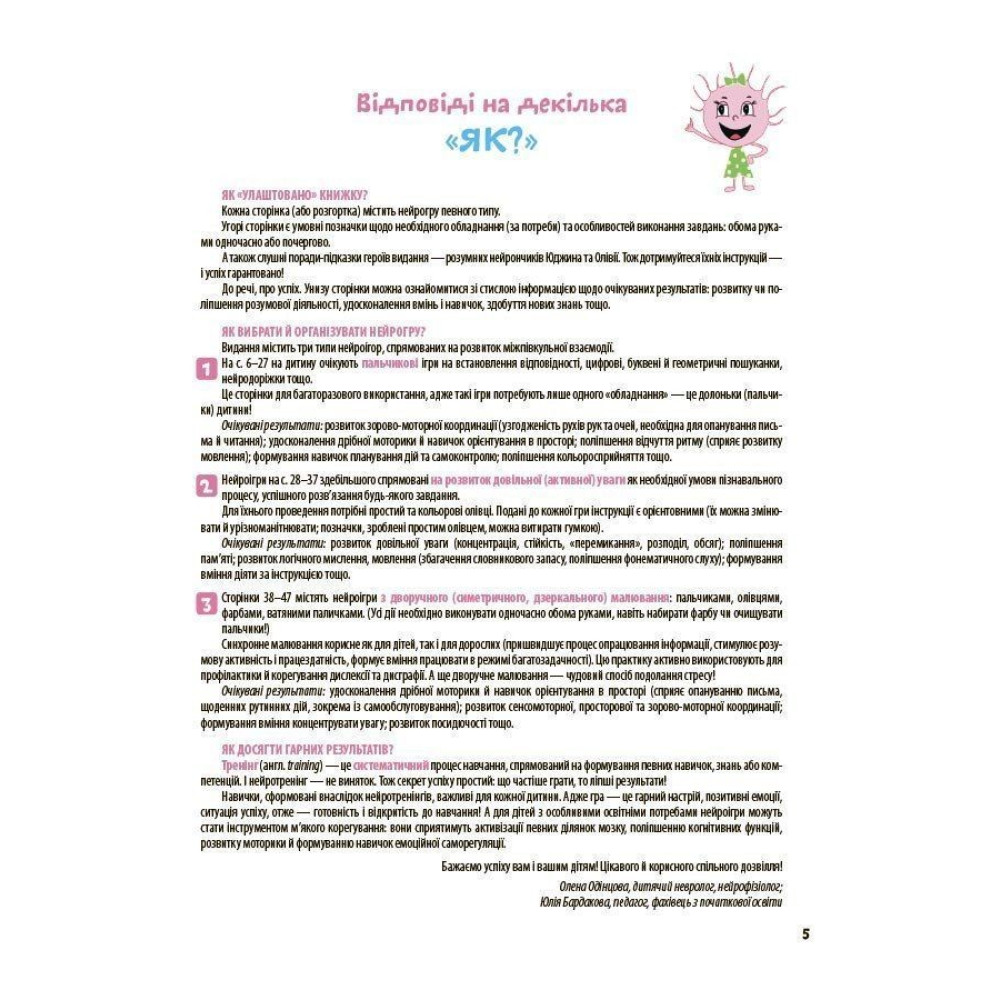 Усі завдання подаються як захоплива гра разом із персонажами — нейрончиками Юджином та Олівією, які крок за кроком супроводжують дитину, мотивують і пояснюють правила. Видання ідеально підходить як для занять удома, так і для використання в школі, на гуртках або в роботі з психологами й педагогами.