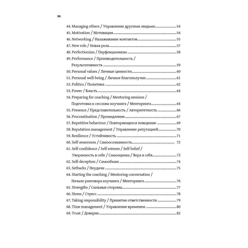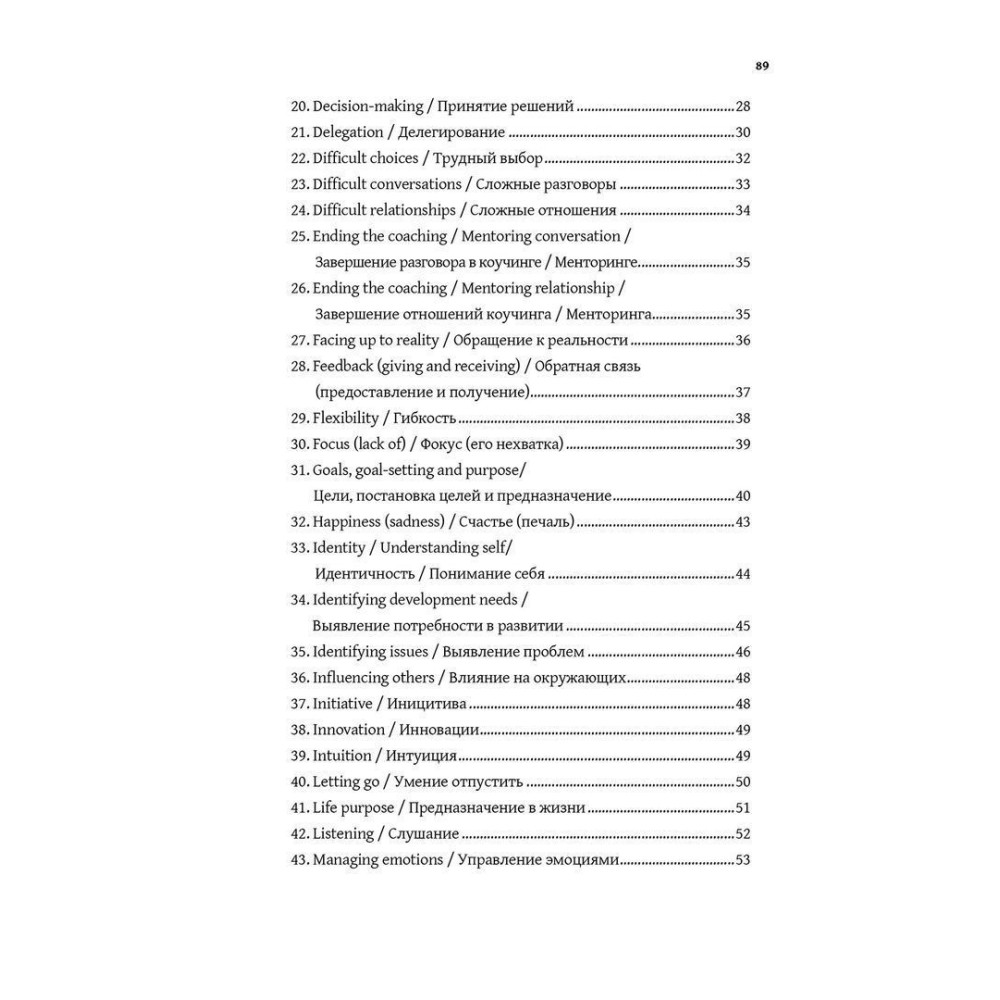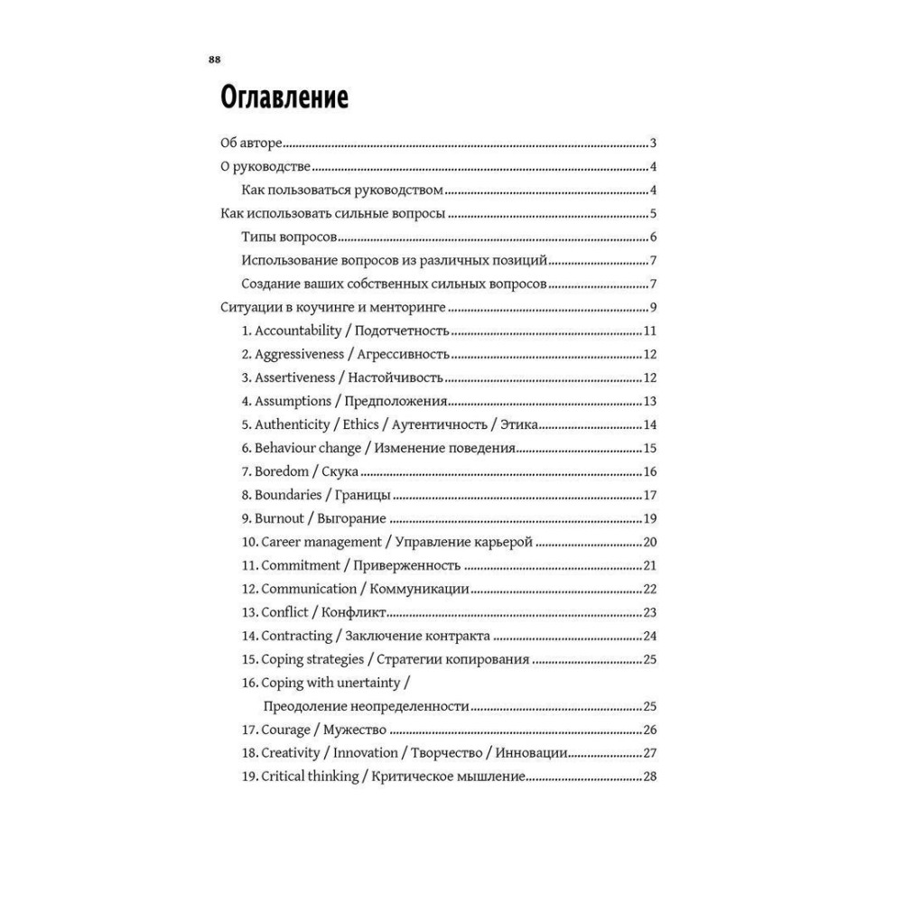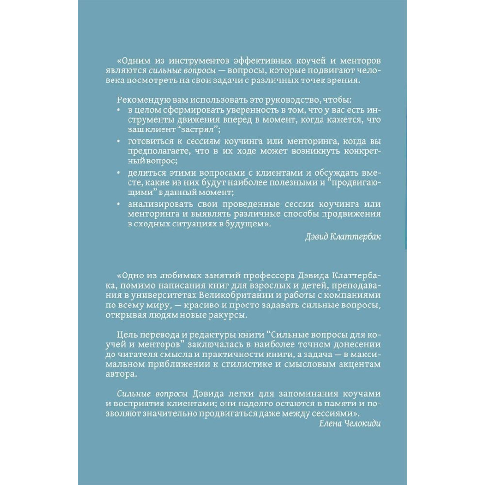 Книга «Сильные вопросы для коучей и менторов: Практическое руководство» Девіда Клаттербака — це по-справжньому цінний посібник для роботи, що допомагає ставити своїм клієнтам сильні питання, які надихають. Для кожної з понад сімдесяти ситуацій пропонується 5-15 запитань. Вони здатні допомогти і коучам, і менторам, і відповідно їхнім клієнтам. У книжці ви знайдете стислий опис ситуації й те, як підходити до проблеми в контексті кожного випадку.