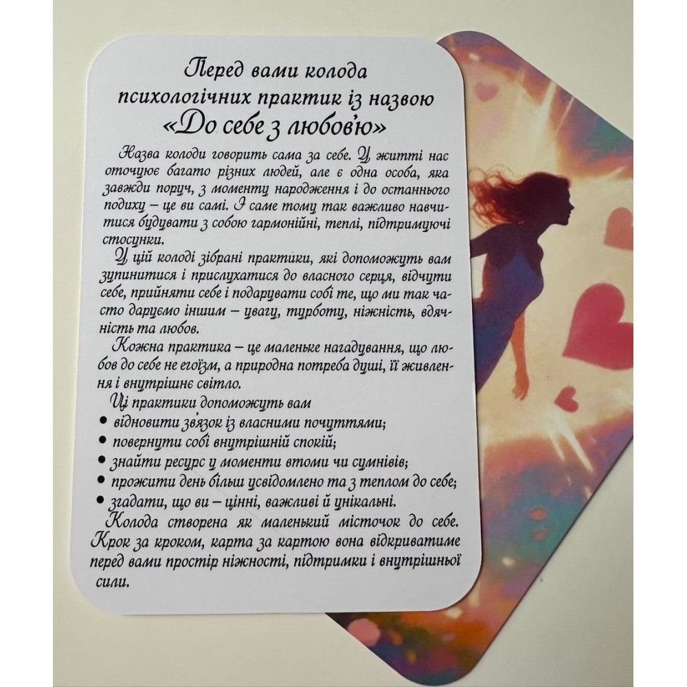 Колода містить психологічні практики, що допомагають зупинитися в потоці справ, прислухатися до власного серця, відчути себе, прийняти себе й подарувати собі те, що ми так часто віддаємо іншим — увагу, турботу, ніжність, вдячність і любов.
