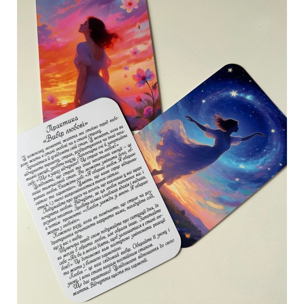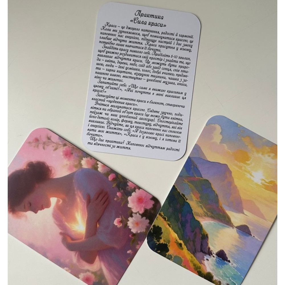 Колода створена як маленька подорож до себе. Крок за кроком, карта за картою вона відкриває простір ніжності, підтримки та внутрішньої сили.
