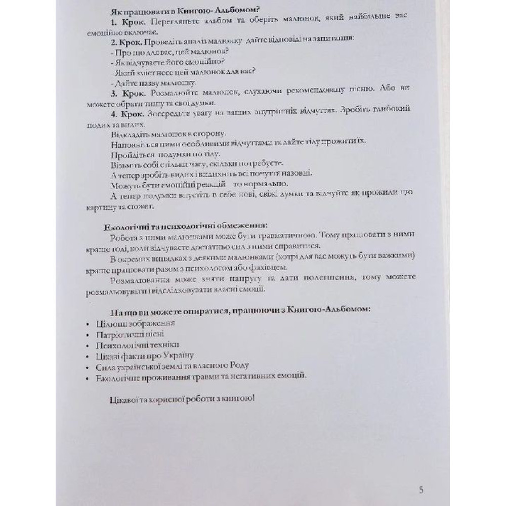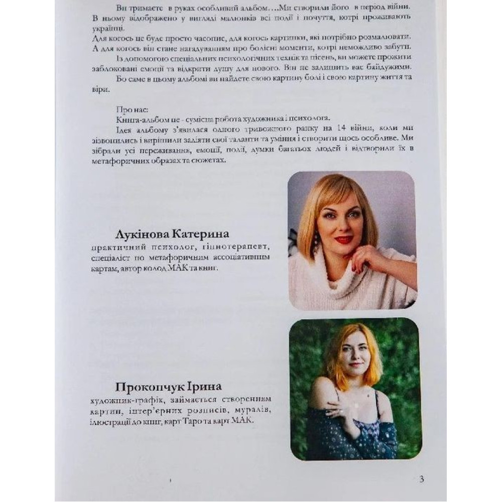 Наша книга-альбом є особливою, тому що увібрала в себе не лише глибокі, потужні малюнки, а ще і психологічні техніки, українську музику війни 2022 року та інші цікаві моменти.