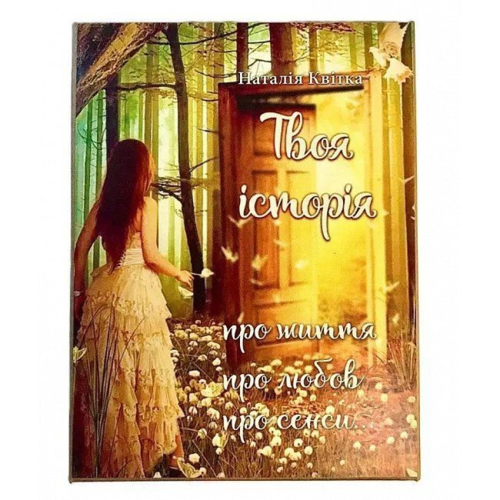 Асоціативні карти Наталії Квітки «Твоя історія» задумані для того, щоб зазирнути в ці таємні куточки душі та попрацювати з ними: щось відпустити, щось переписати, зробити ці спогади легшими, приємнішими, яскравішими. Для того, щоб краще пізнати себе, свої мрії, цілі та бажання, зрозуміти, що важливо насправді. Для того, щоб зазирнути в майбутнє, відчути і написати продовження своєї історії, яка поки що існує тільки в нашій уяві. Продовження яскраве, красиве, таке, що запалює душу і кличе вперед — до нових щасливих моментів нашого життя.