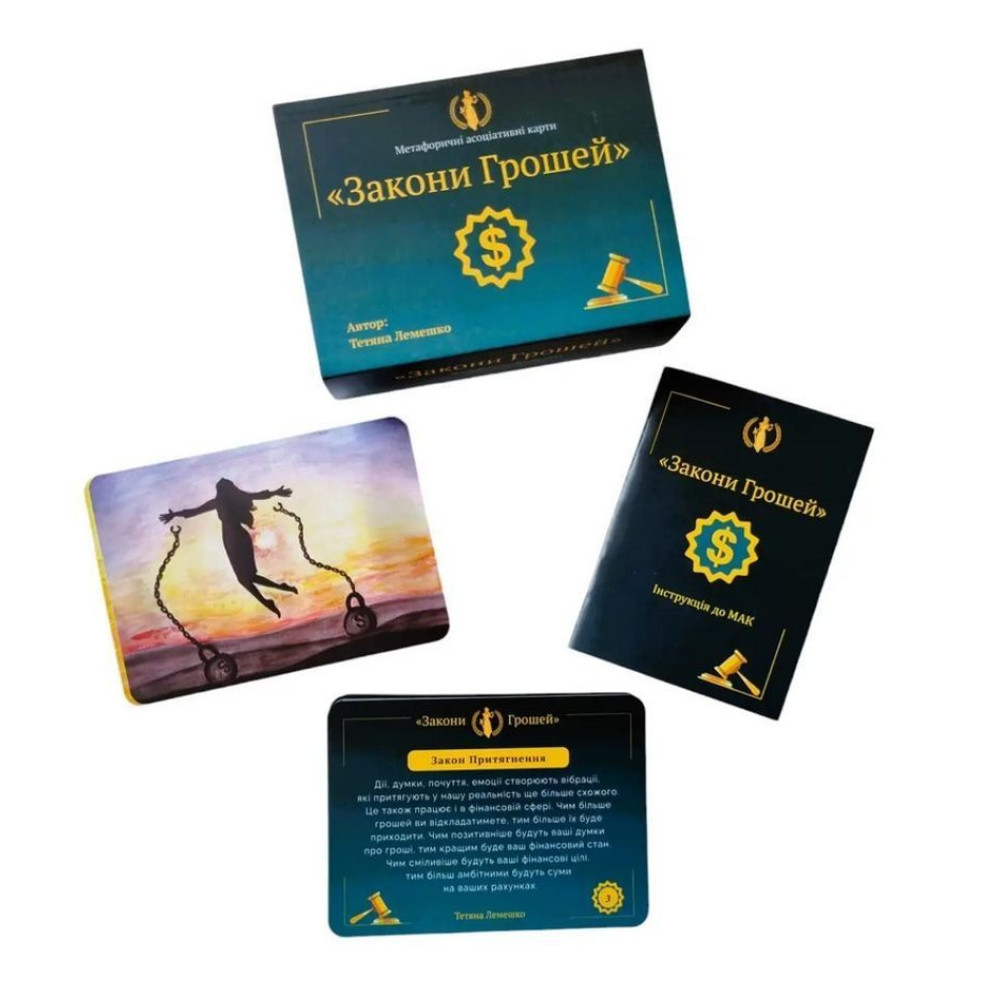 Колода МАК «Закони Грошей» від Тетяни Лемешко — це не просто про грошові закони, це про закони достатку всесвіту, закони успіху та процвітання. Через це, коли ви візьмете колоду до рук ви зможете працювати з нею в будь-яких запитах, отримати підказку на будь-яке питання, вивчати закони достатку всесвіту для досягнення своїх цілей.