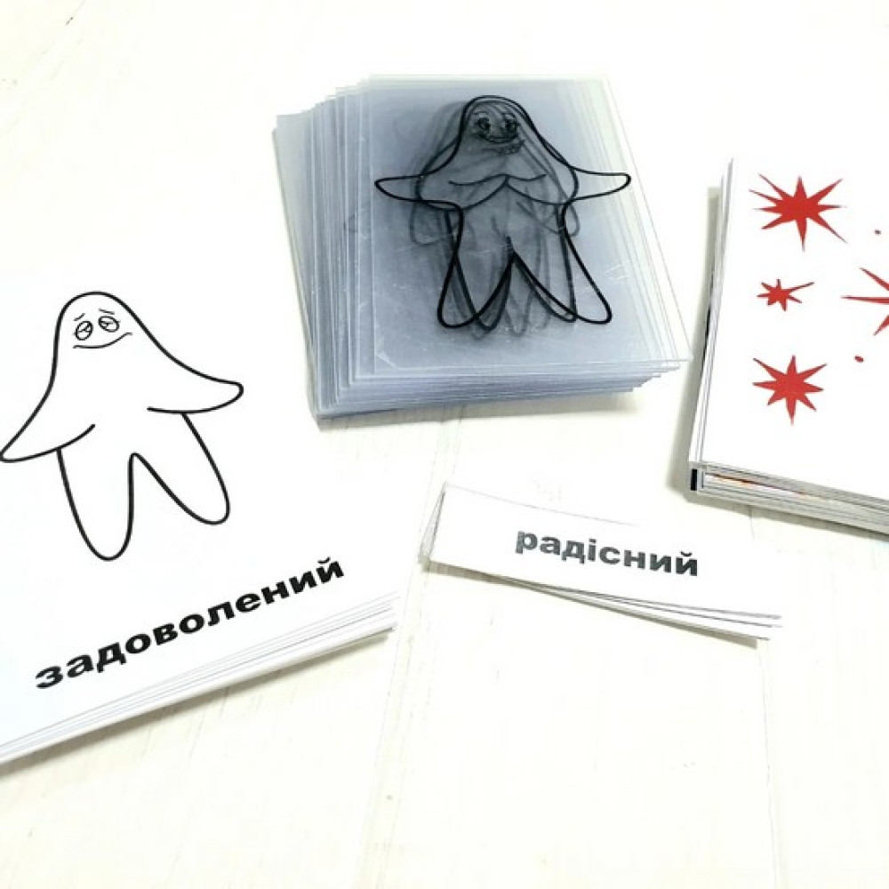 картки із зображенням силуетів на білому тлі з назвами емоційних станів — 9 шт;