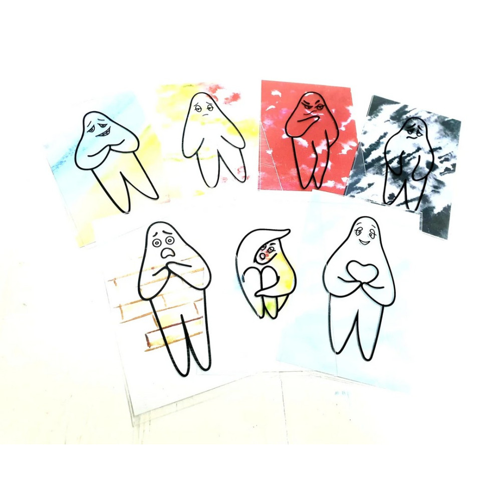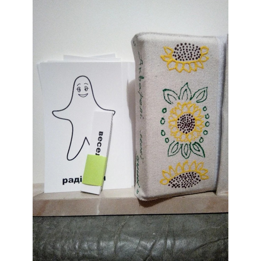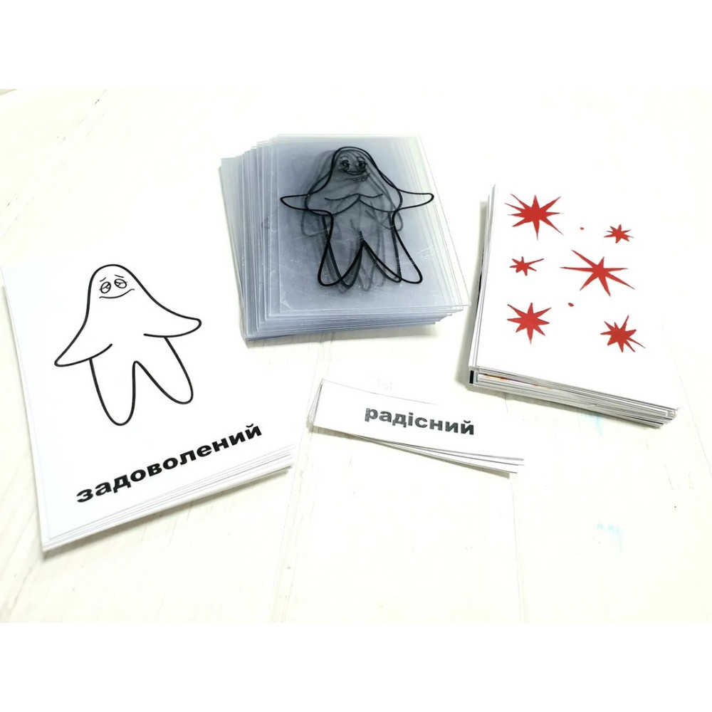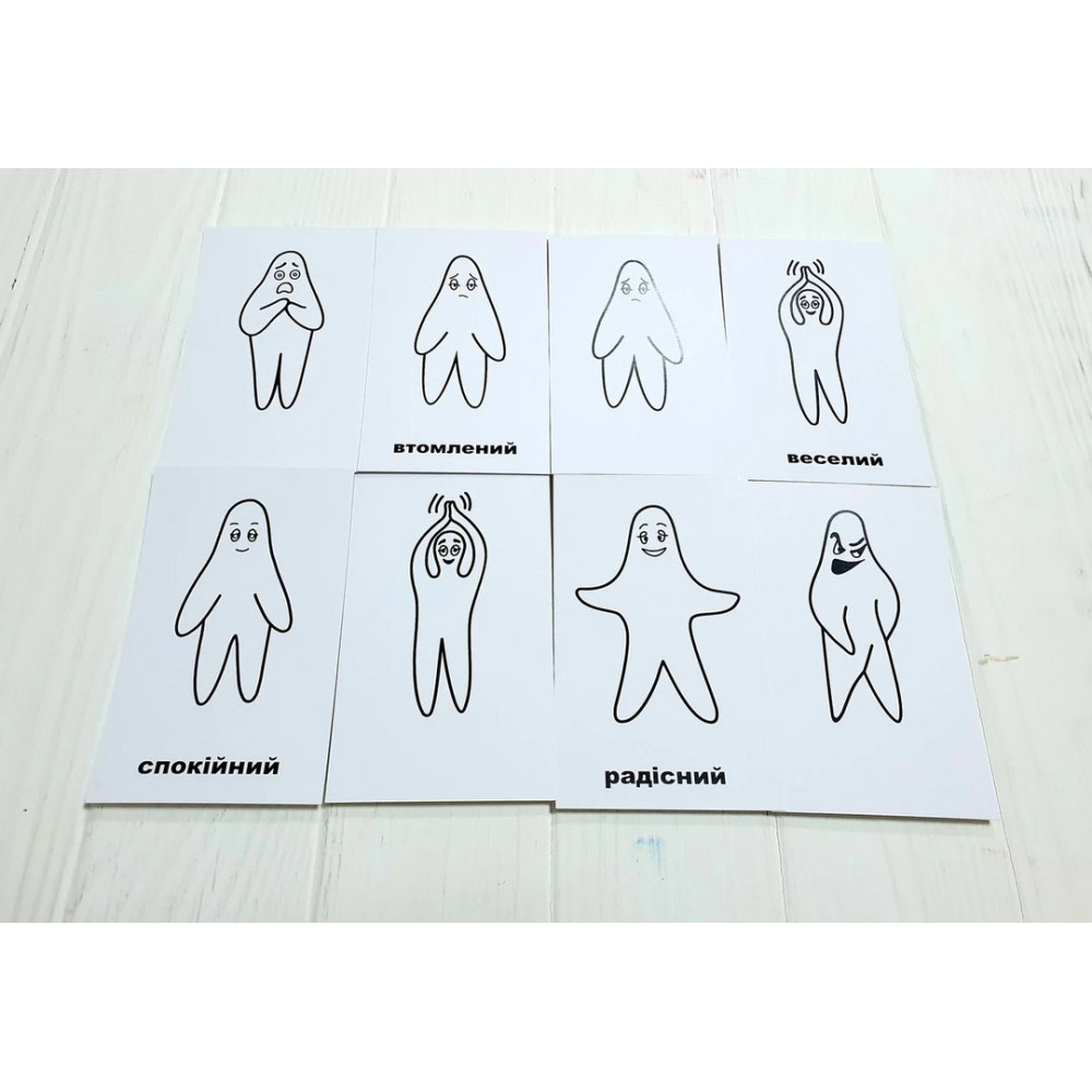 картки із зображеннями силуетів на білому тлі з назвами емоційних станів — 9 шт;
