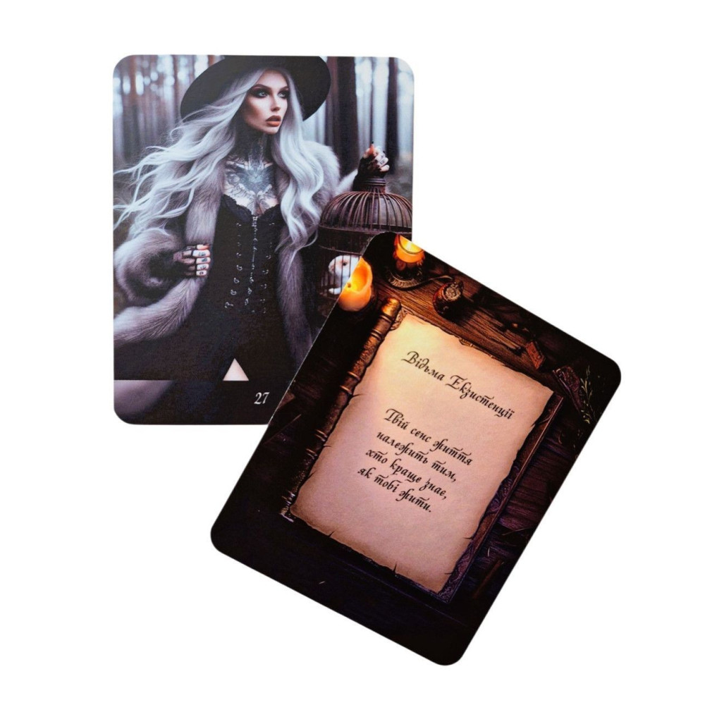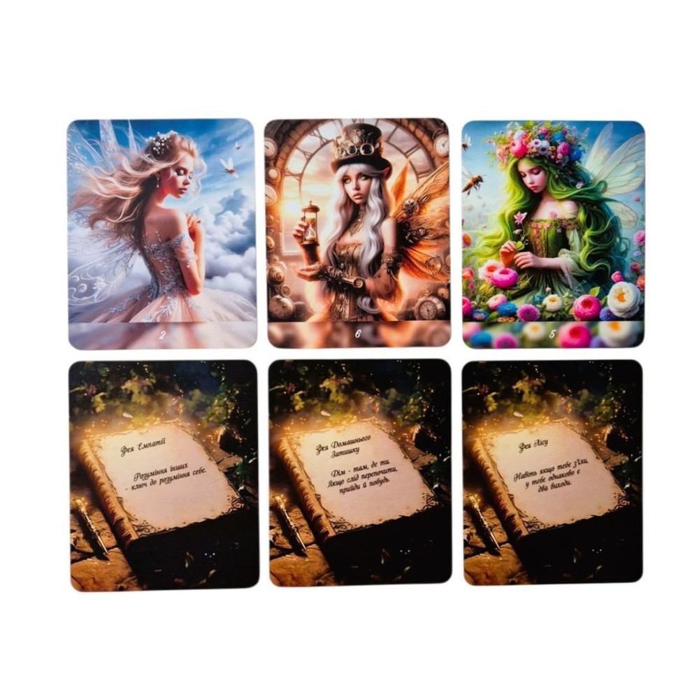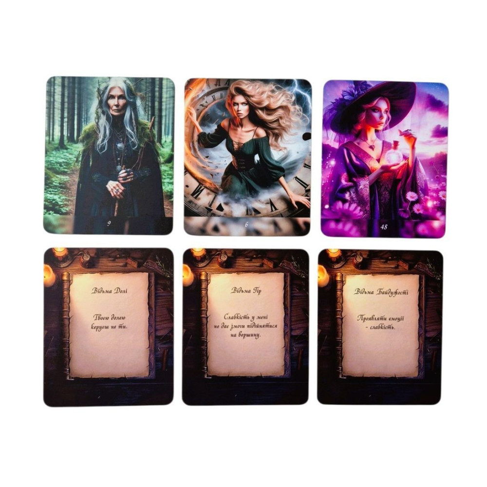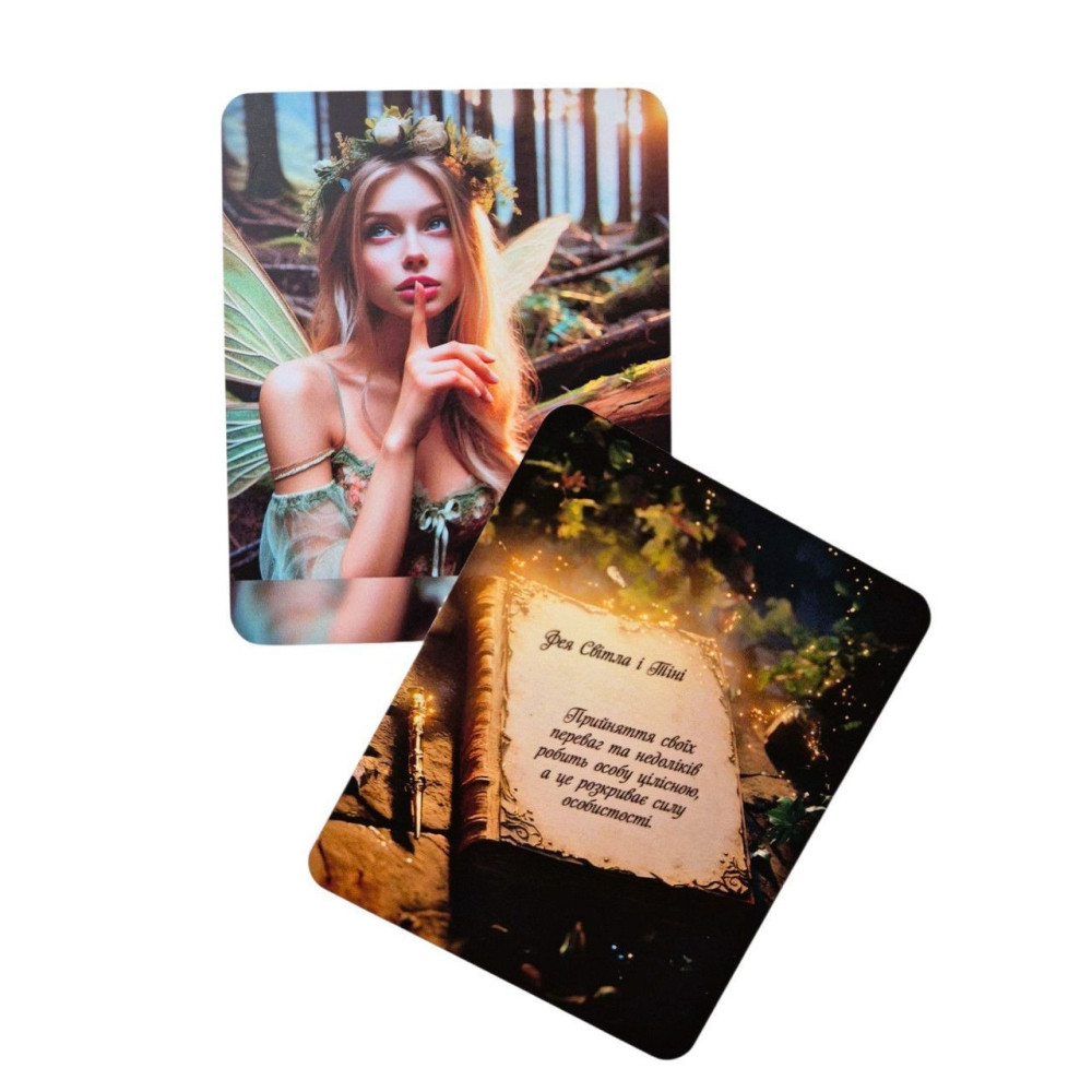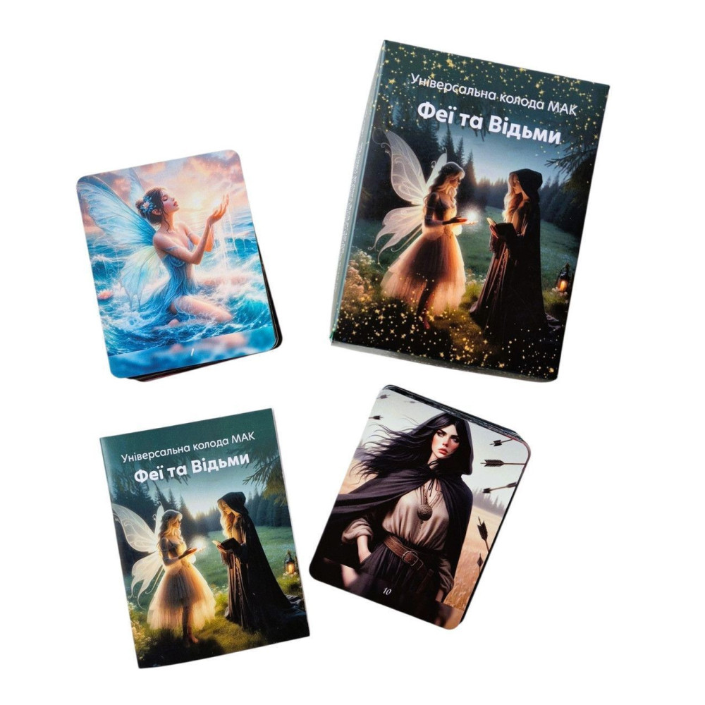 100 двохсторонніх карт (високоякісного друку з матовою ламінацією, що забезпечує довговічність, розмір карт 8*10 см) із зображенням фей та відьом, на зворотньому боці — ресурсні послання і блокуючі переконання.