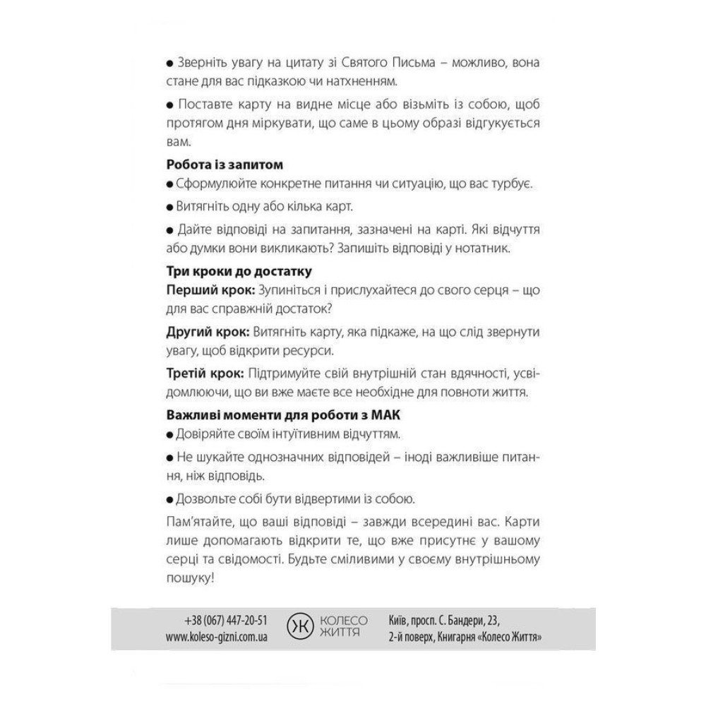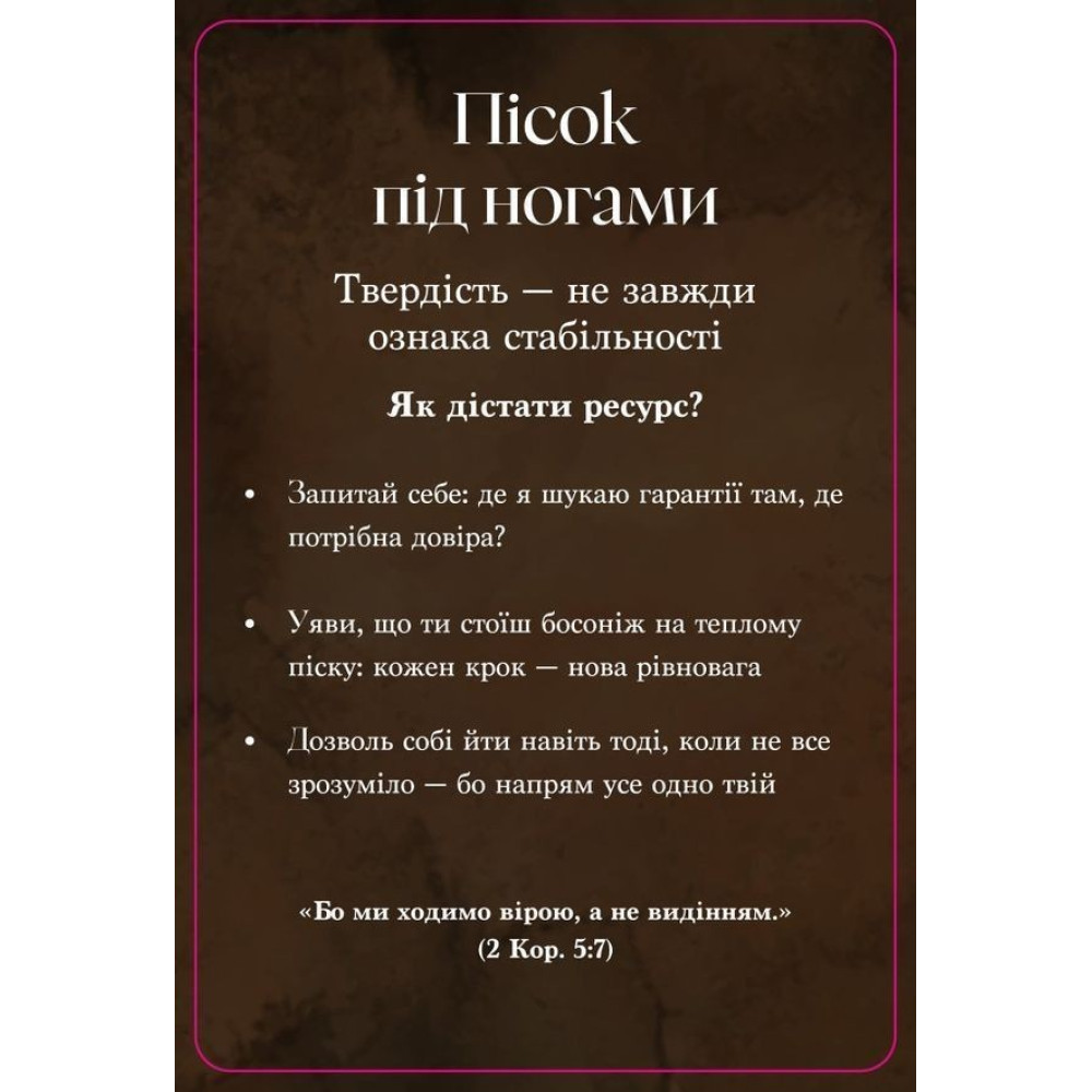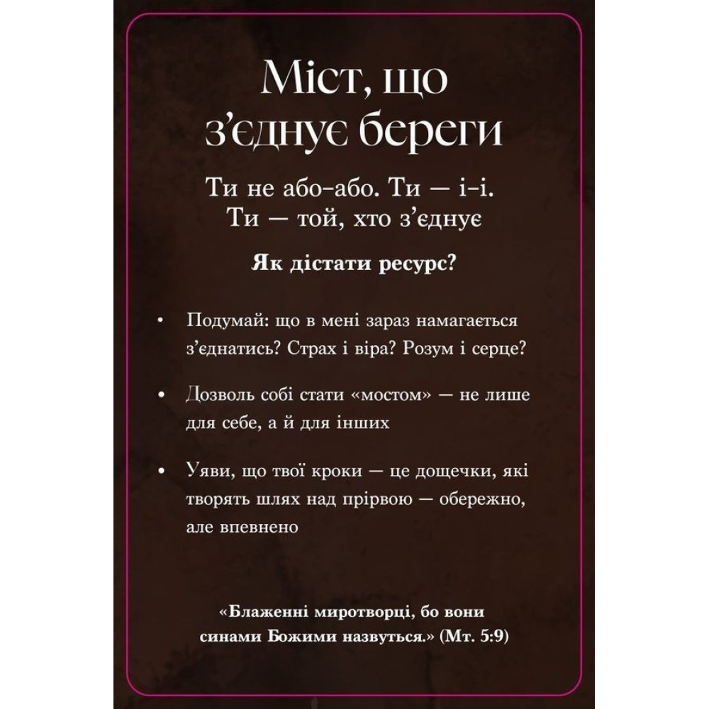 Витягніть карту і подивіться на зображення – що ви відчуваєте? Прочитайте три кроки і цитату зі Святого Письма на звороті. Залиште карту на видному місці або візьміть із собою як нагадування про глибину моменту.
