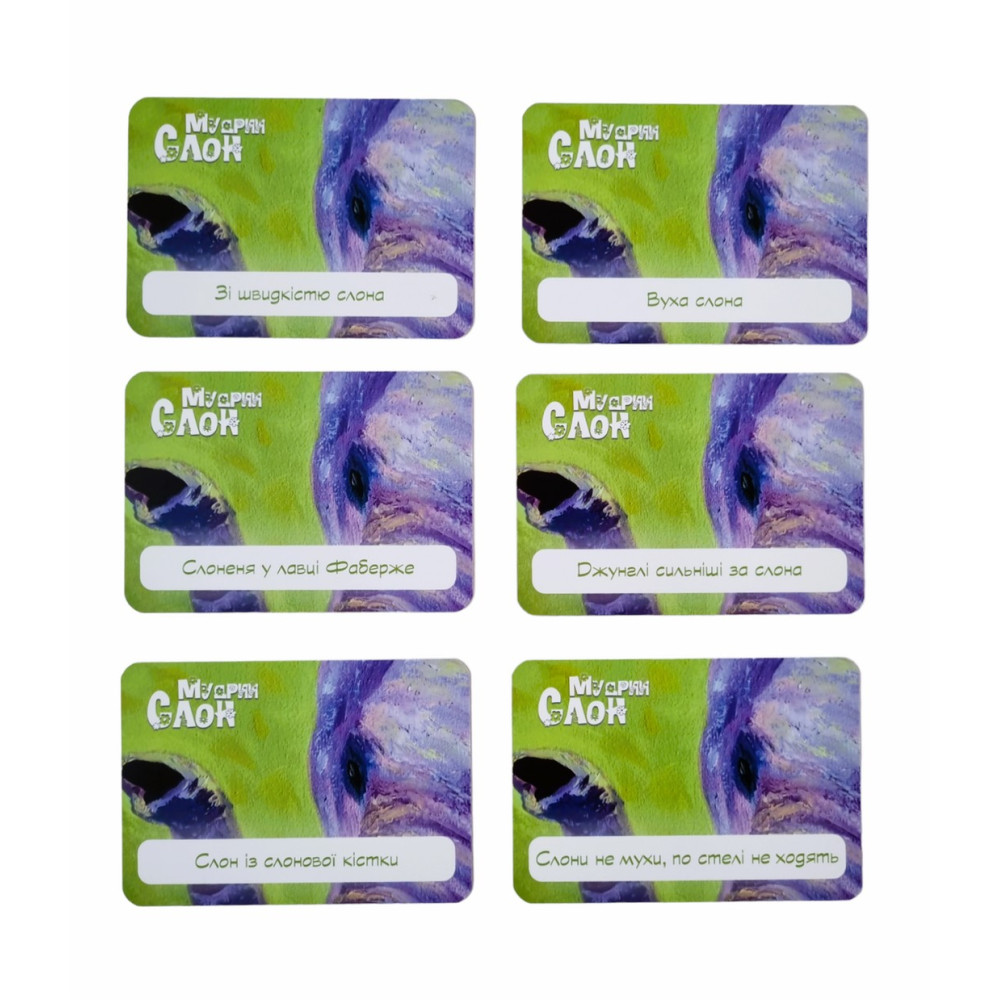 46 карток (з одного боку картинка, з іншого — крилата фраза про слонів);