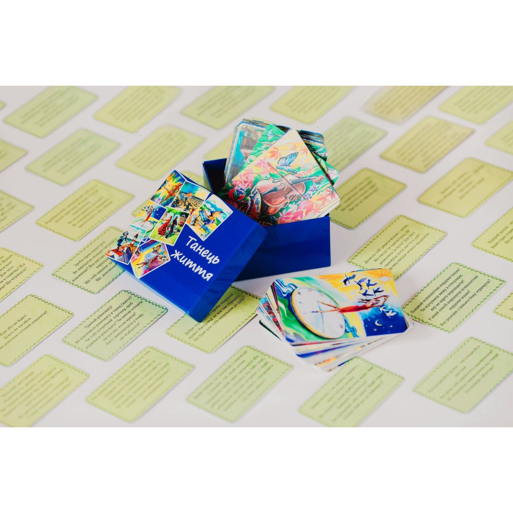 Танець Розуміння, Танець Впевненості, Танець Сили, Танець Свободи, Танець Мудрості, Танець Кохання... Танець є чудовою моделлю для дослідження себе і взаємин. Колода «Танець Життя» дозволяє експериментувати, міняти сценарій емоційного реагування, поведінки людини, переносити терапевтичний досвід в життєвий простір. Вона є ресурсною, несе в собі емоційний заряд для позитивних змін, відновлення емоційних станів, пробудження внутрішніх ресурсів та інше.