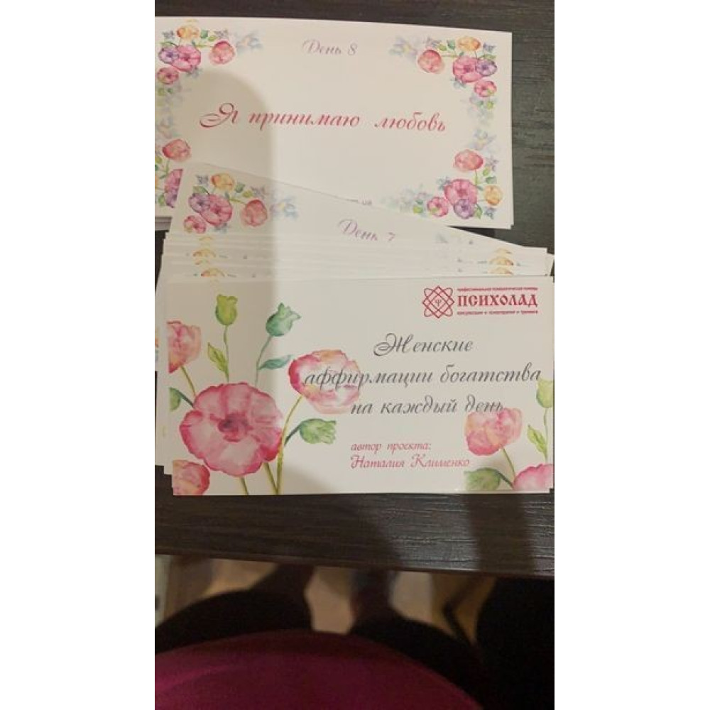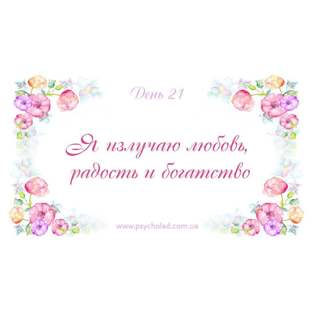 Щодня беремо по одній картці з афірмацією, що відповідає дню роботи з «Женскими аффирмациями богатства на каждый день» (для зручності на кожній картці написаний День).