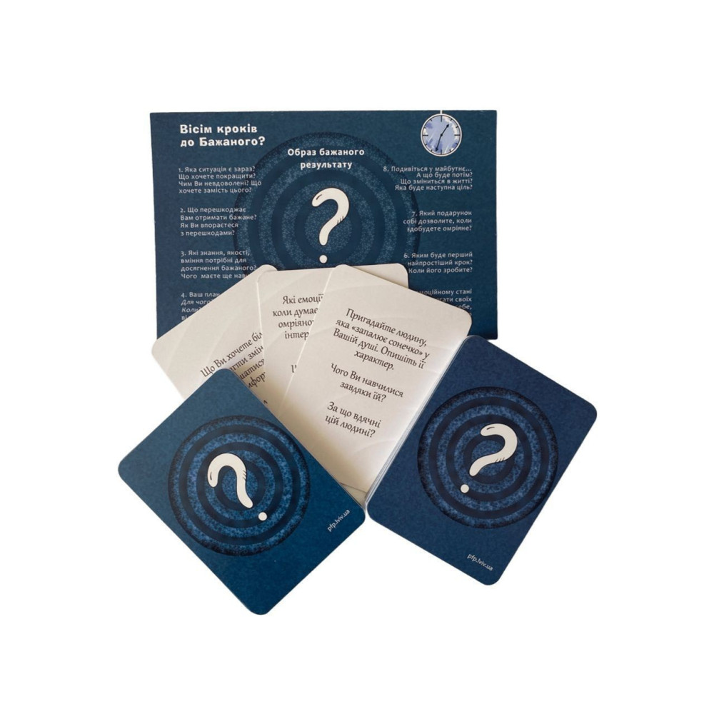 Робота у парах. Завдання для кожного учасника: сформулюйте ціль, яку хочете досягти; оберіть наосліп 5-7 карток з колоди з наміром «Я хочу витягти запитання, відповіді на які наблизять мене до бажаного»; логічно упорядкуйте картки з питаннями. Відповіді обговоріть у парах та поділіться враженнями з іншими учасниками тренінгу.
