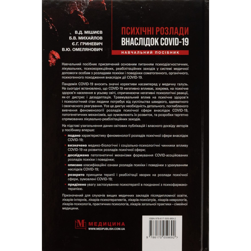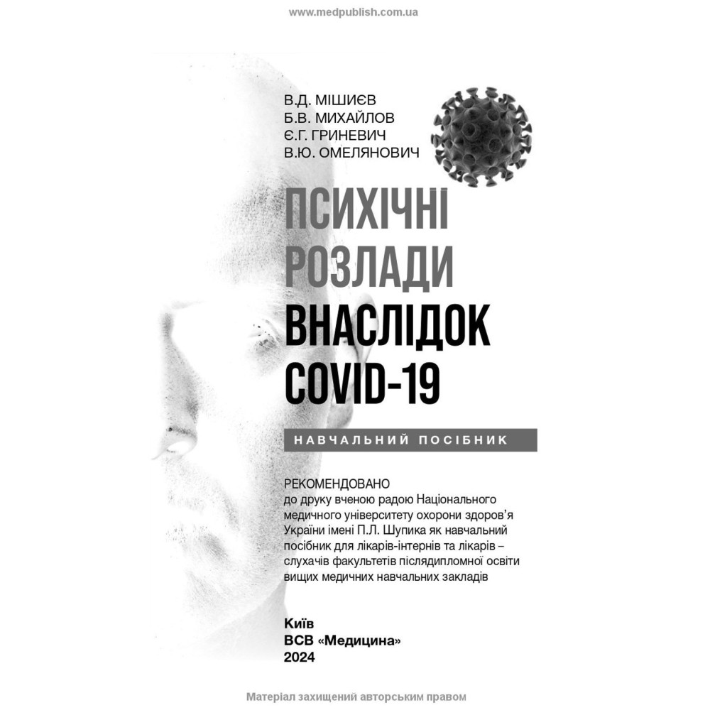 Навчальний посібник «Психічні розлади внаслідок COVID-19» за авторством В'ячеслава Д. Мішиєва, Бориса В. Михайлова, Євгенії Г. Гриневич та Віталія Ю. Омеляновича присвячений основним питанням психодіагностичних, лікувальних, психокорекційних, реабілітаційних заходів у системі медичної допомоги особам з розладами психіки і поведінки соматогенного, органічного, психогенного походження внаслідок дії COVID-19.