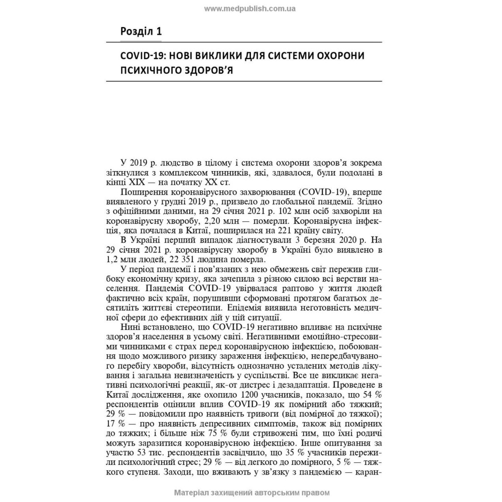 Пандемія COVID-19 вносить значні корективи насамперед у медичну галузь. На сьогодні встановлено, що COVID-19 негативно впливає, зокрема, на психічне здоров’я населення в усьому світі, спричинюючи негативні психологічні реакції, як-от дистрес і дезадаптація. Травмувальний вплив на психічне здоров’я і психологічний стан людини потребує від суспільства швидкого, адекватного і своєчасного реагування. Усе це диктує необхідність детального, поглибленого вивчення феноменології розладів психічної сфери внаслідок COVID‑19, патогенетичних механізмів, що зумовлюють їх розвиток, та розробки таргетно спрямованих лікувально-реабілітаційних заходів.