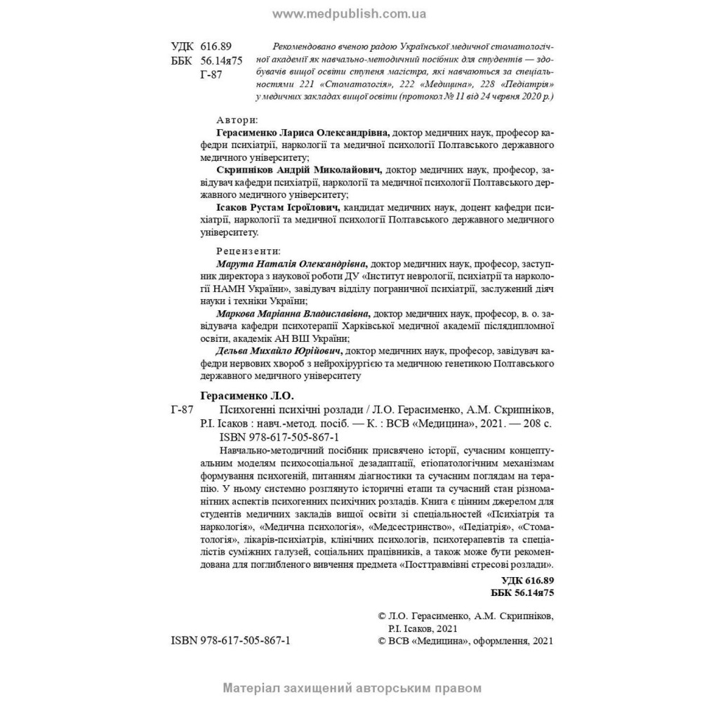 Навчально-методичний посібник «Психогенні психічні розлади» за авторством Лариси О. Герасименко, Андрія М. Скрипнікова та Рустама І. Ісакова присвячено історії, сучасним концептуальним моделям психосоціальної дезадаптації, етіопатологічним механізмам формування психогеній, питанням діагностики та сучасним поглядам на терапію. У ньому системно розглянуто історичні етапи та сучасний стан різноманітних аспектів психогенних психічних розладів.