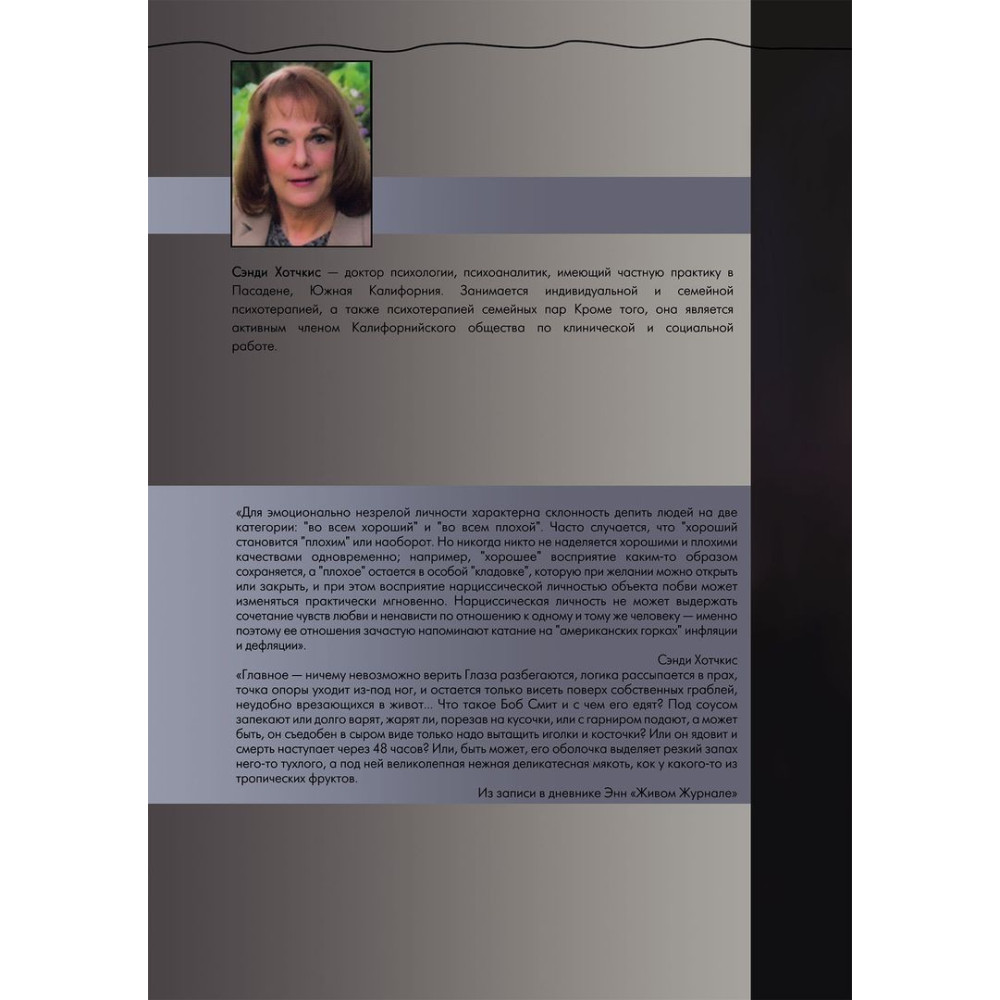 «Адская паутина. Как выжить в мире нарциссизма» — це перша популярна книга про нарцисизм, у якій Сенді Хотчкіс визначає ознаки нарцисичного розладу особистості, причини його появи, пов'язані з ранньою дитячою травмою, і дає практичні рекомендації, як психологічно захиститися, перебуваючи в суспільстві нарциса.