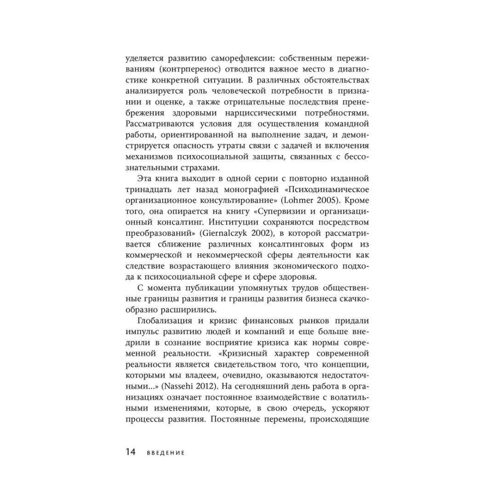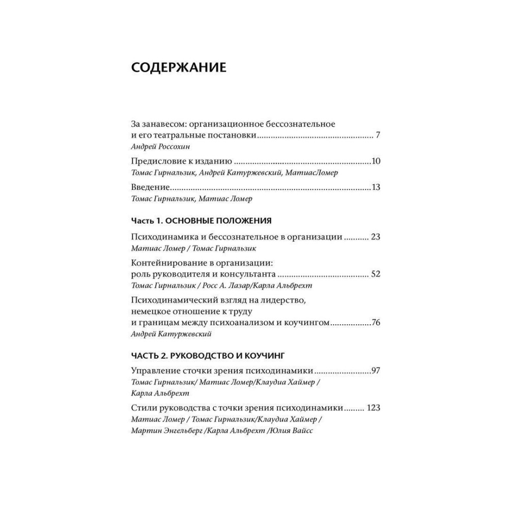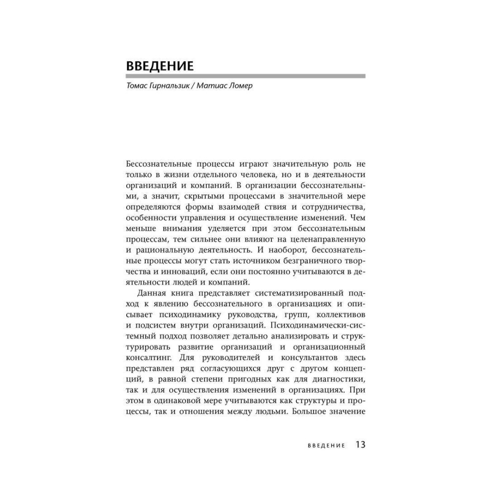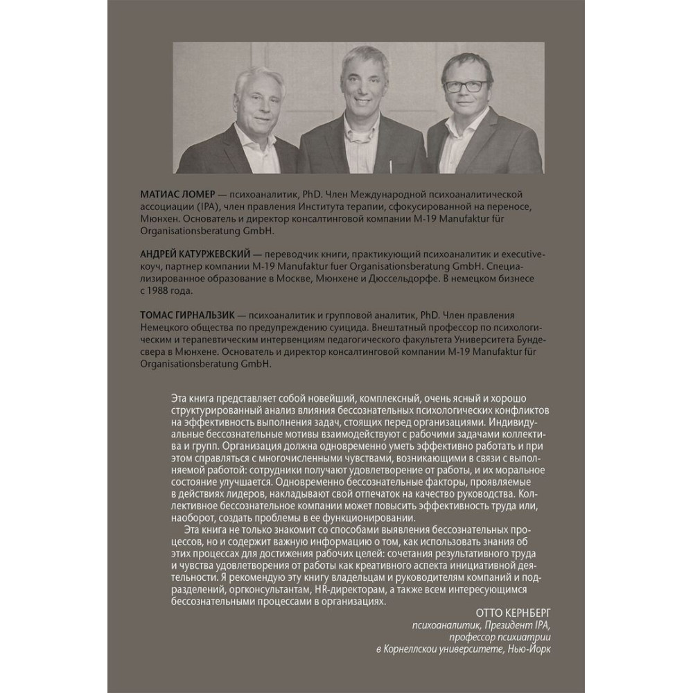 Книга «Бессознательное в организации. Психодинамика руководства, консалтинга и управления изменениями» за авторством Томаса Гірнальзика, Андрія Катуржевського й Матіаса Ломера являє собою новітній, комплексний, дуже ясний і добре структурований аналіз впливу несвідомих психологічних конфліктів на ефективність виконання завдань, що стоять перед організаціями.