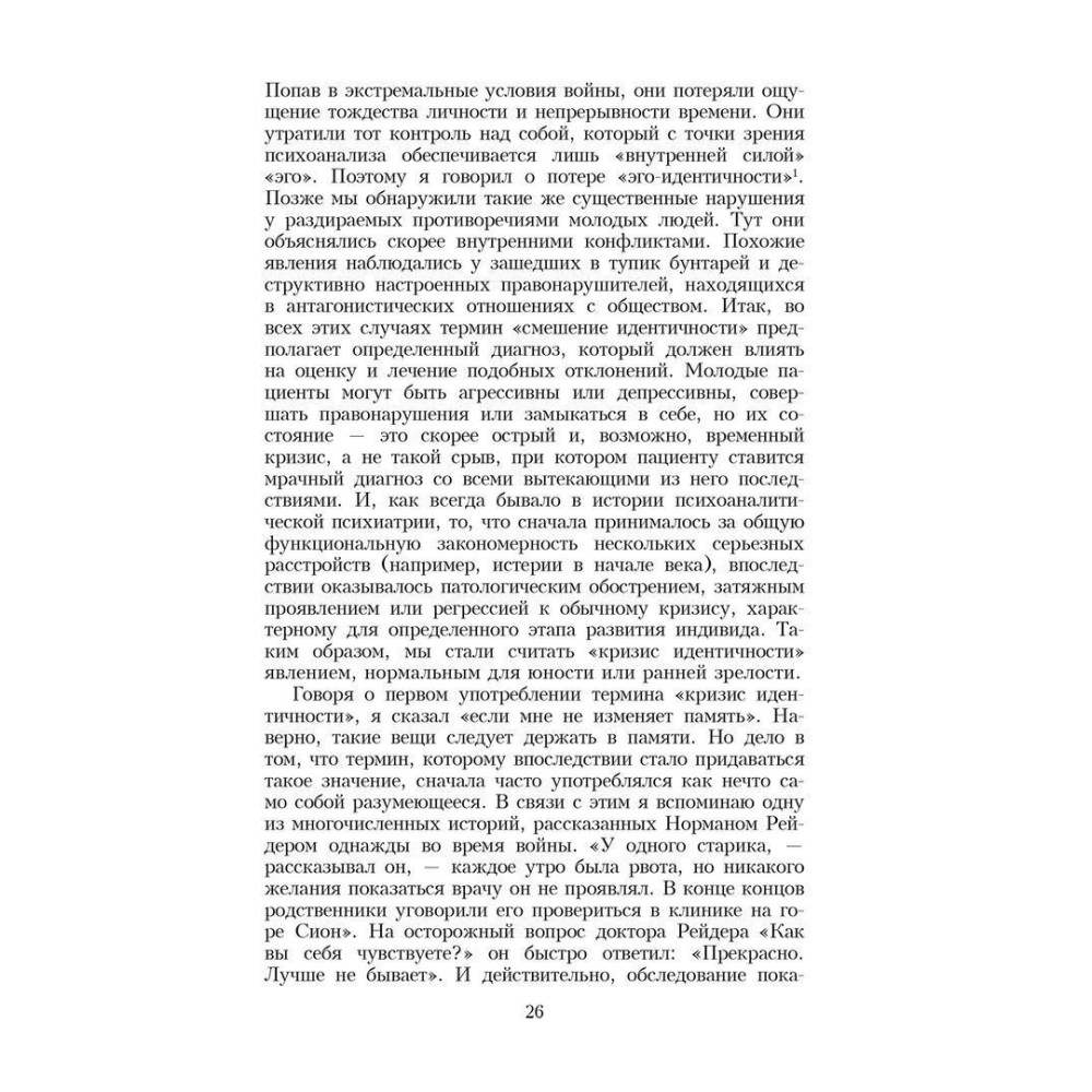 Аналізуючи основні аспекти юнацької кризи ідентичності, автор простежує індивідуальні життєві цикли, послідовність поколінь і структуру суспільства. У традиціях неофройдизму Еріксон шукає витоки долі окремої особистості в особливостях її життєдіяльності на ранніх етапах життя.