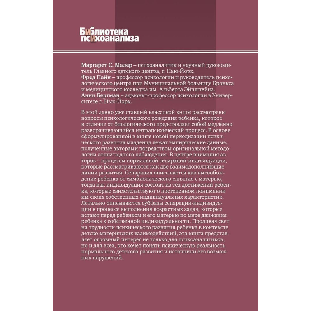 Книга «Психологическое рождение человеческого младенца: Симбиоз и индивидуация» від таких авторів як Маргарет С. Малер, Фред Пейн та Анні Бергман давно стала класичною, обговорювала питання психологічного народження дитини, яка, на відміну від біологічного, є повільно розгортаючим внутрішньопсихічним процесом. Основою, сформульованою в книзі нової періодизації психічного розвитку дитини, є емпіричні дані, отримані авторами за допомогою оригінальної методології поздовжнього спостереження.