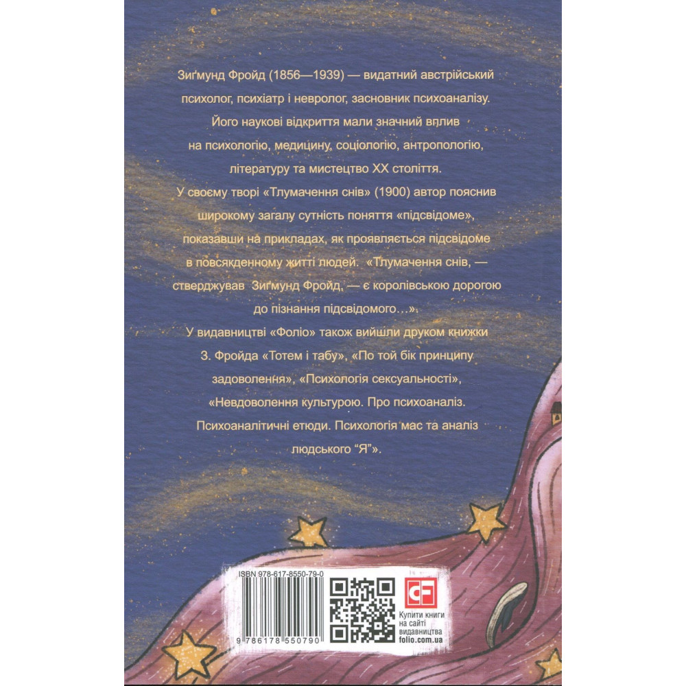 «Тлумачення снів» — фундаментальна праця засновника психоаналізу Зиґмунда Фройда, яка назавжди змінила уявлення людства про психіку, підсвідоме та внутрішні механізми бажань. Саме в цій книзі Фройд уперше системно пояснює, що сни — це не випадкові образи, а зашифровані повідомлення підсвідомості, які відкривають шлях до розуміння прихованих переживань, конфліктів і прагнень людини.