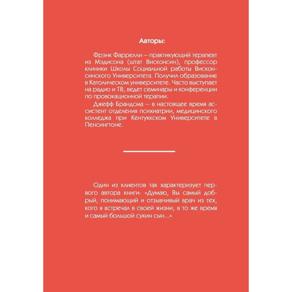 Френк Фаррелі та Джеффрі Брандсма в оригінальній манері розповідають про свою методику роботи з пацієнтами у книзі «Провокационная терапия».