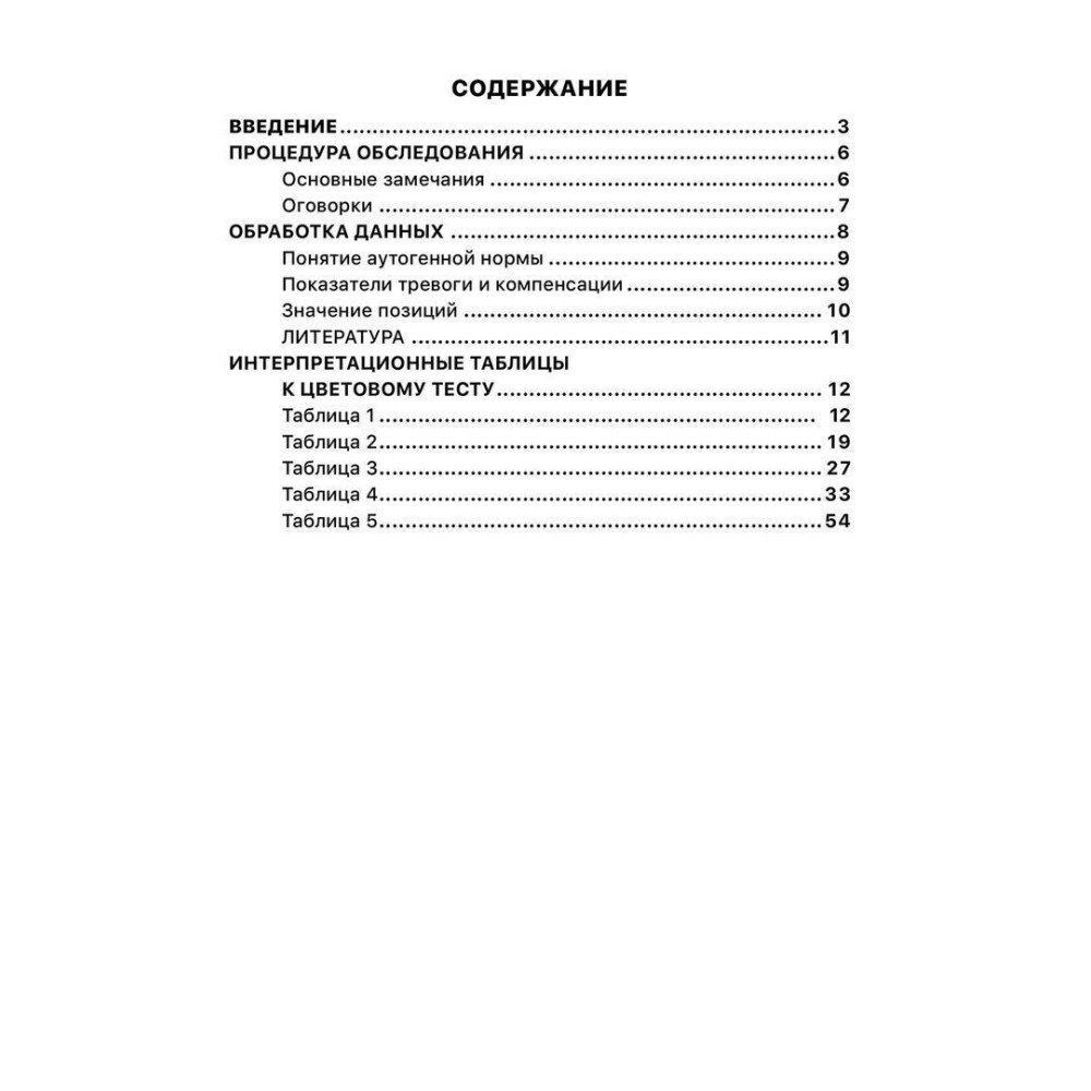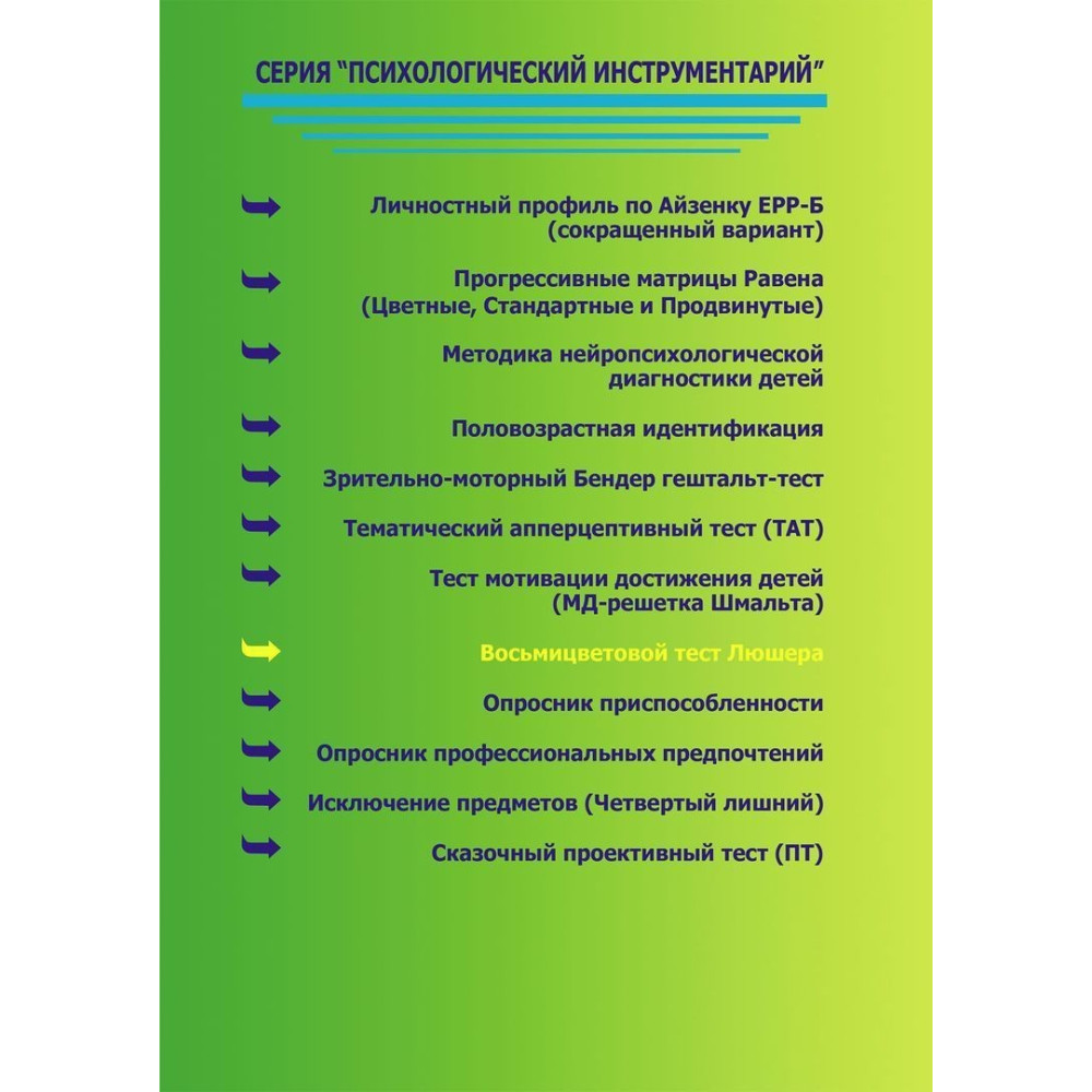 У цьому посібнику описано процедуру обстеження з використанням колірного тесту М. Люшера, роз'яснено спосіб опрацювання даних, наведено інтерпретаційні таблиці.