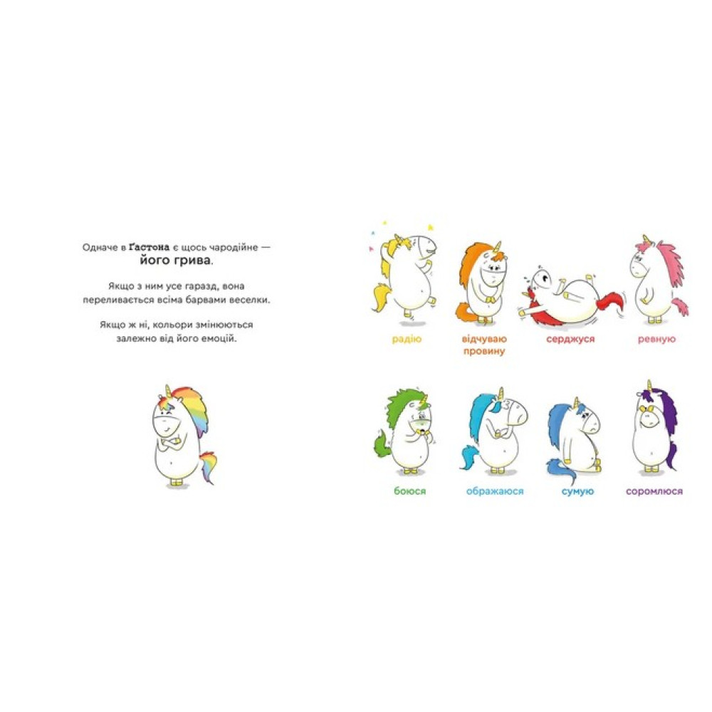 Ґастон, герой книжечки «Емоції Ґастона. Я впевнений у собі» від Орелі Ш'єн Шо Шін — це малий єдиноріг. Він такий, як і всі інші, або майже такий… Його веселкова грива змінює барви залежно від того, яку емоцію він відчуває!