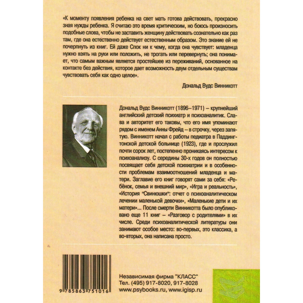 Дональд Вудс Віннікотт — англійський дитячий психіатр і психоаналітик. Слава і авторитет його такі, що його ім'я згадують поряд з ім'ям Анни Фройд — в рядок, через кому. Віннікотт починав з роботи педіатра в Паддінгтонській дитячій лікарні, а з середини 30-х років він присвячує себе дитячій психіатрії і проблем взаємин немовляти і матері.