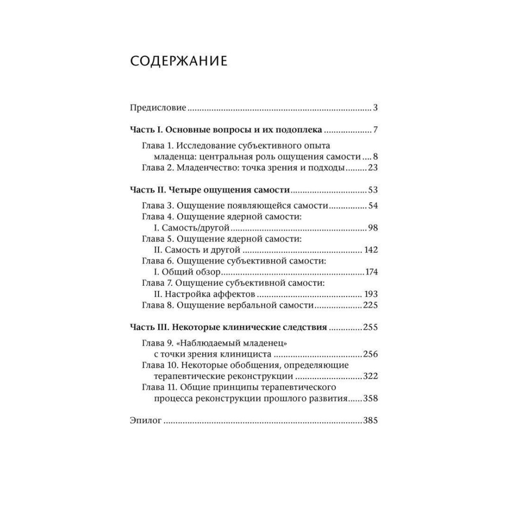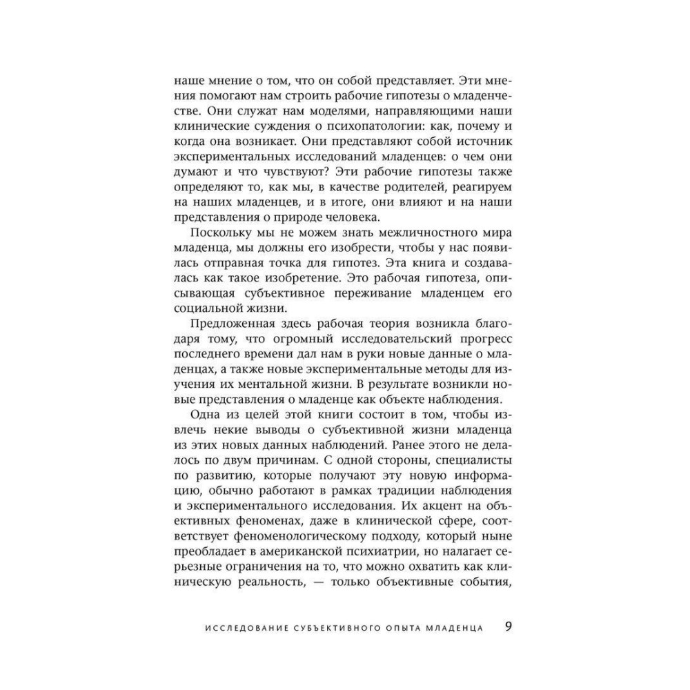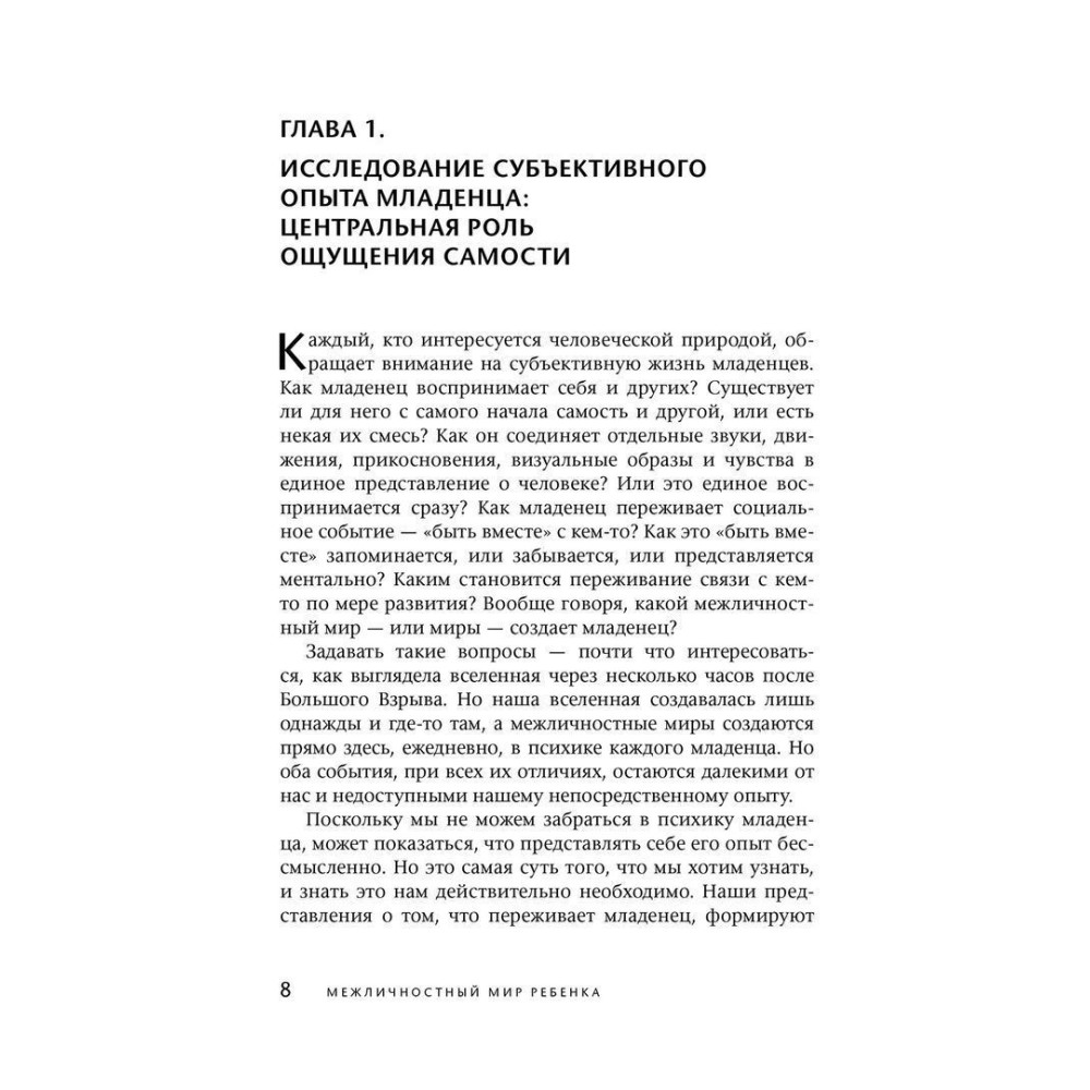 Як немовля сприймає себе та інших? Чи існує для нього від самого початку він сам і інший, чи є якась неподільна спільність? Як воно з'єднує окремі звуки, рухи, дотики, візуальні образи та почуття в єдине уявлення про людину? Чи це єдине сприймається одразу? Як немовля переживає соціальну подію — «бути разом» із кимось? Як це «бути разом» запам'ятовується, чи забувається, чи уявляється ментально? Яким стає переживання зв'язку з кимось у міру розвитку? Взагалі кажучи, який міжособистісний світ — або світи — створює немовля? На ці та інші питання, що стосуються суб'єктивного життя немовляти, намагається знайти відповіді автор, який поєднує підходи клініциста й дослідника та методики психоаналізу й психології розвитку.