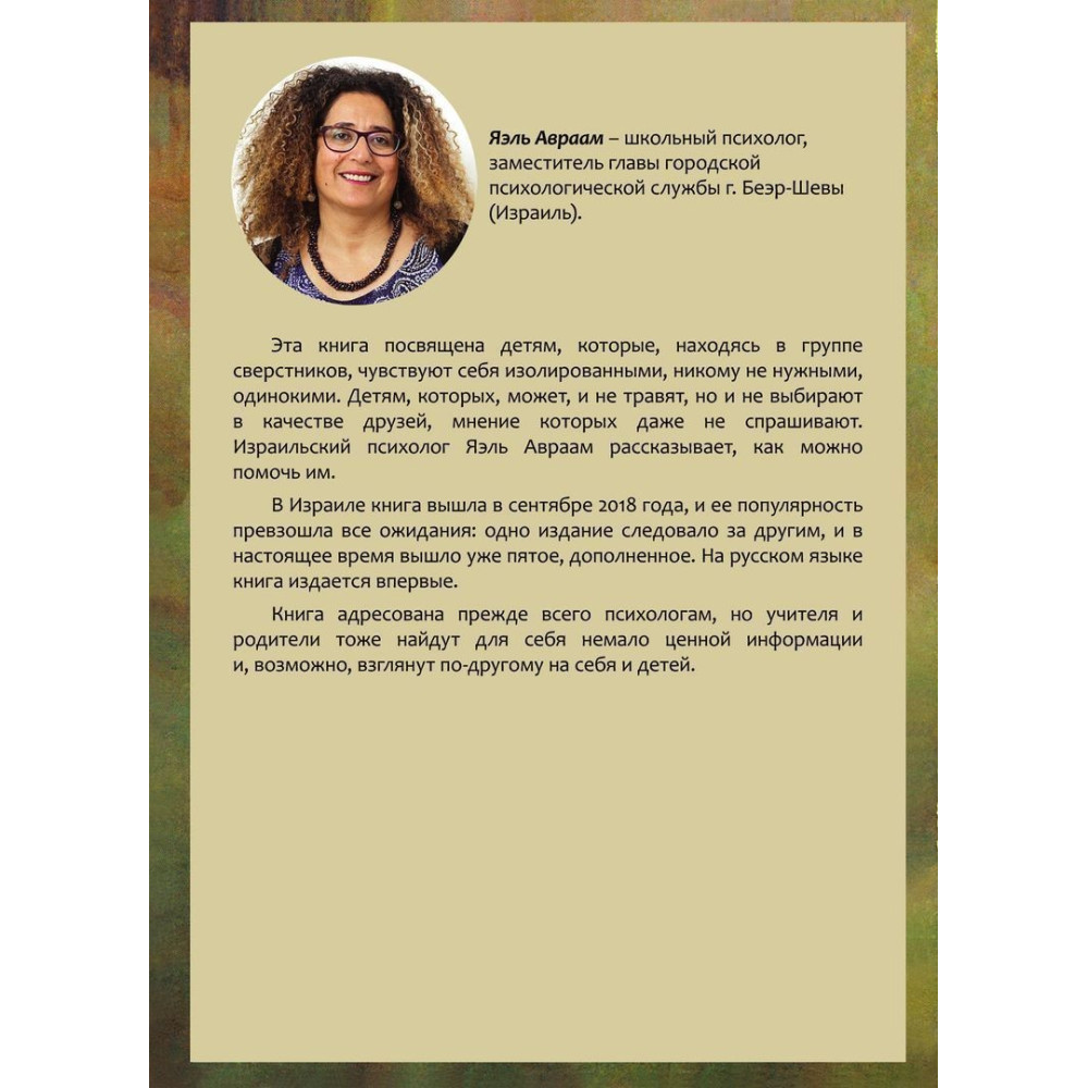 Книга Яель Авраам «Почему со мной никто не дружит? Психологическая помощь детям-изгоям» присвячена дітям, які, перебуваючи в групі однолітків, почуваються ізольованими, нікому не потрібними, самотніми. Дітям, яких, може, й не цькують, але й не обирають як друзів, думку яких навіть не питають. Ізраїльська психологиня Яель Авраам розповідає, як можна допомогти їм.