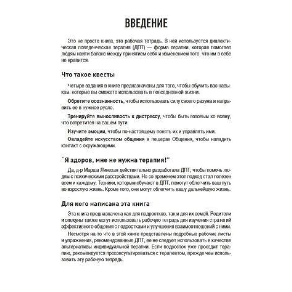 За допомогою ДПТ люди вчаться приймати себе такими, якими є і змінювати те, що їм у собі не подобається. Заповнивши цей робочий зошит з навичок ДПТ, підлітки набудуть веселого, захопливого та ігрового досвіду, що мотивує сучасну розсіяну молодь на виконання роботи. Це вже наполовину виграна битва! Автори доклали багато зусиль, зробивши дизайн і графіку книжки привабливими для очей, щоб зберегти інтерес і захопити читача.